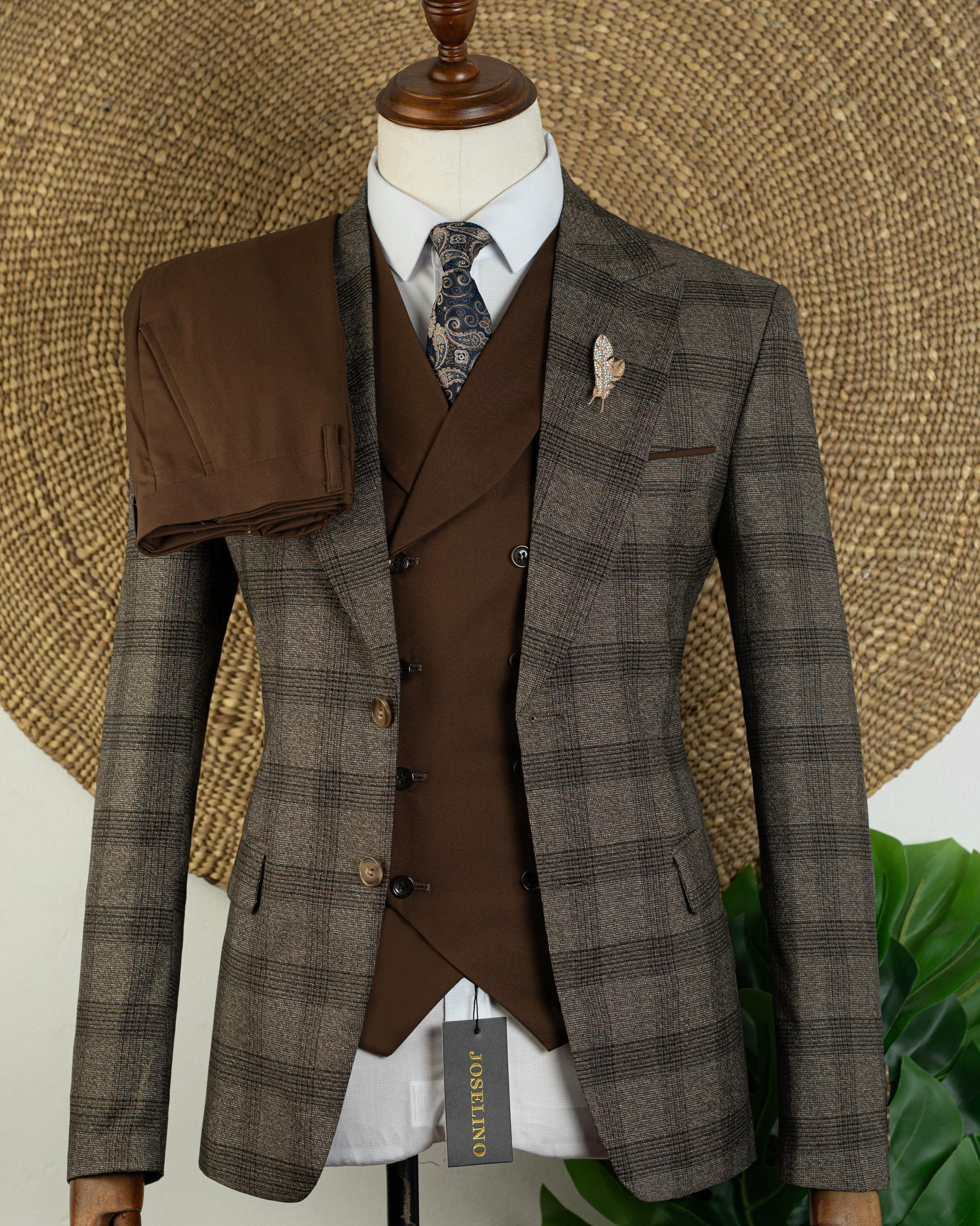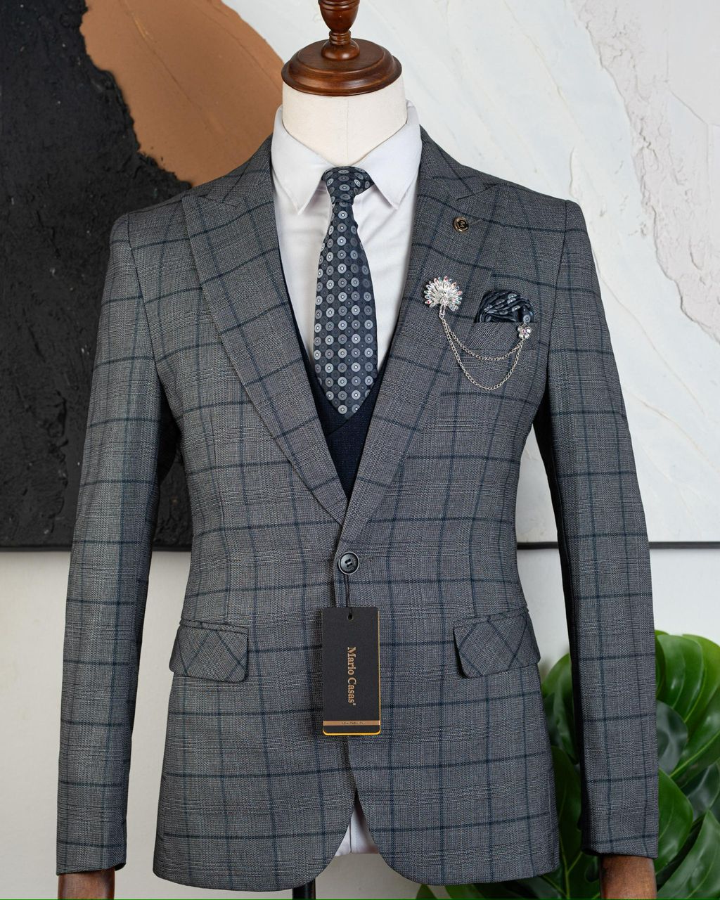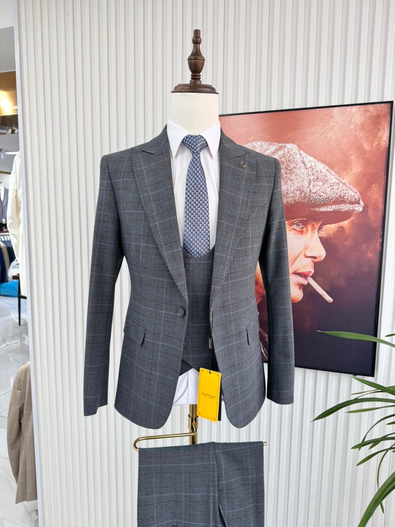 "Mario Casas" Luxury 3-Piece Suit – Grey with Blue Checkered Pattern