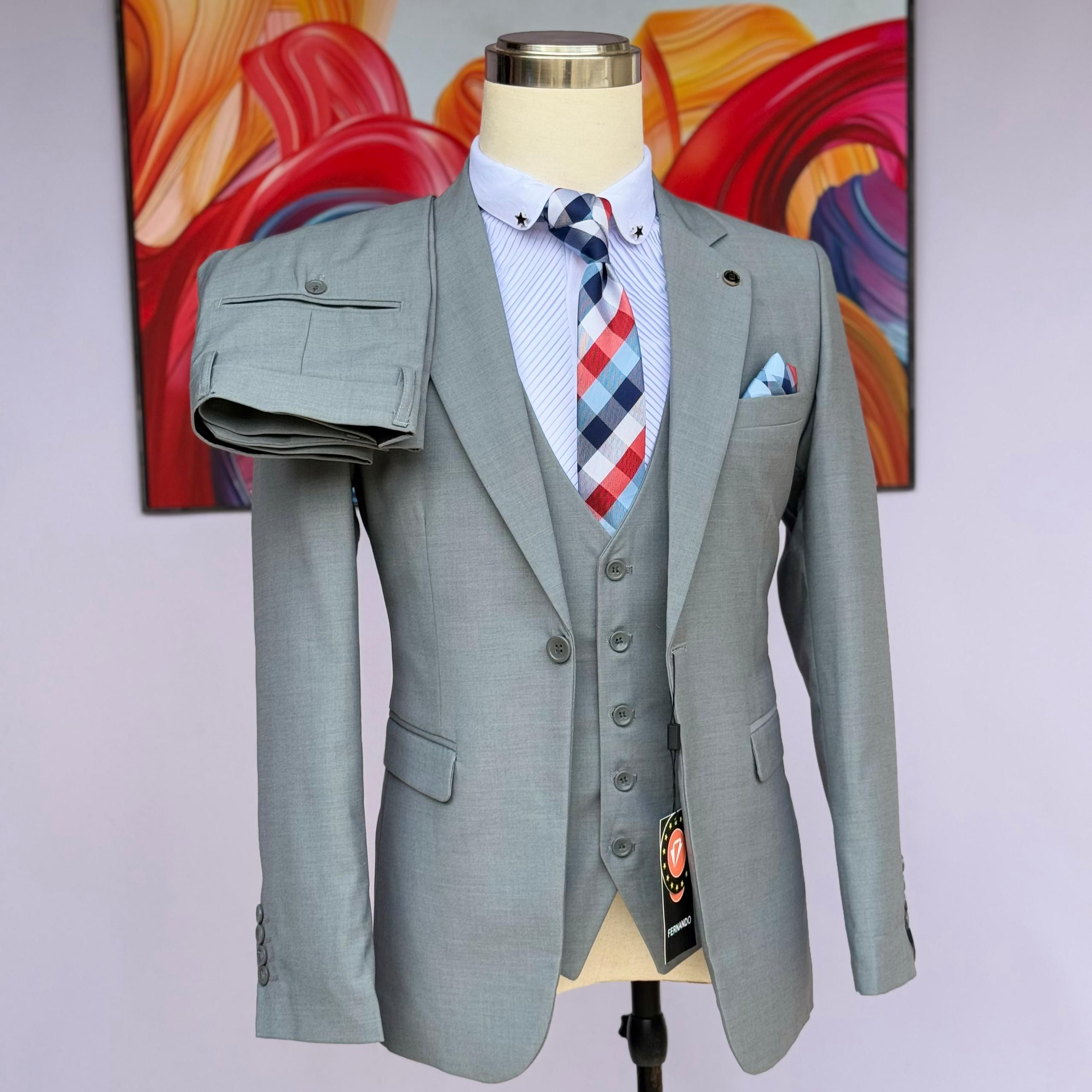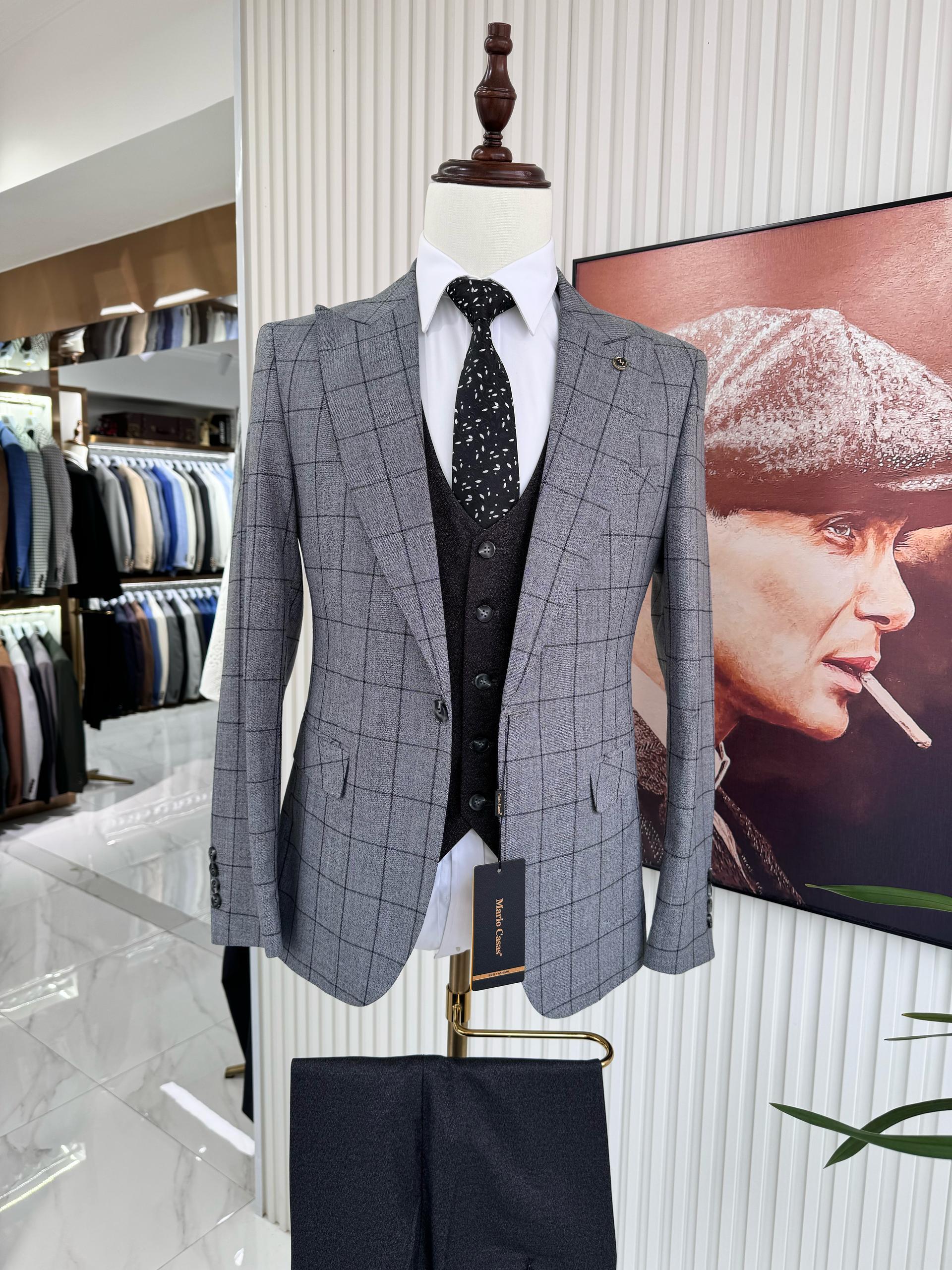 "Mario Casas" Luxury 3-Piece Suit – Grey with Blue Checkered Pattern
