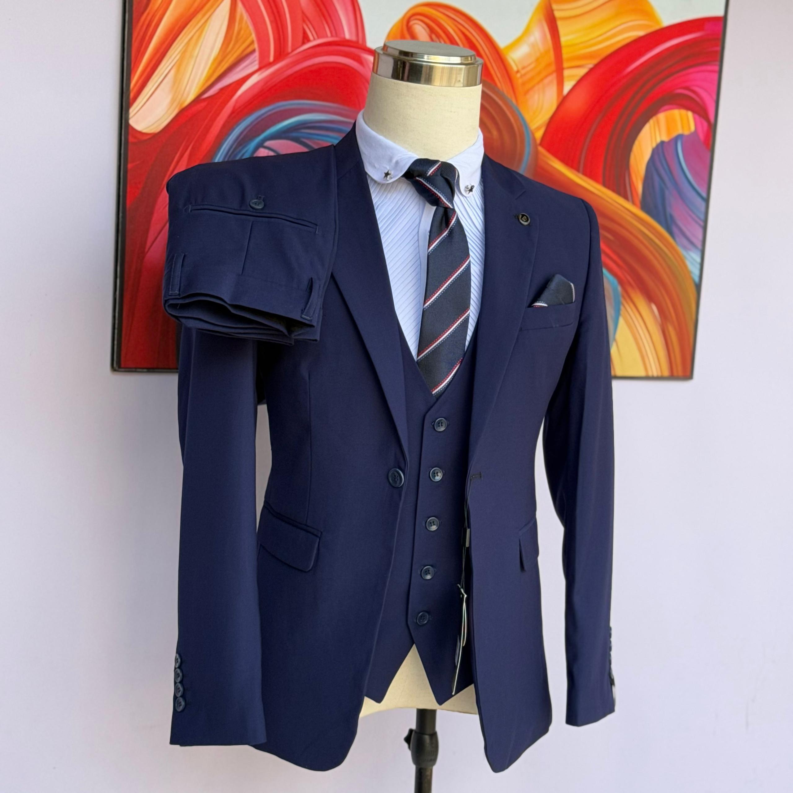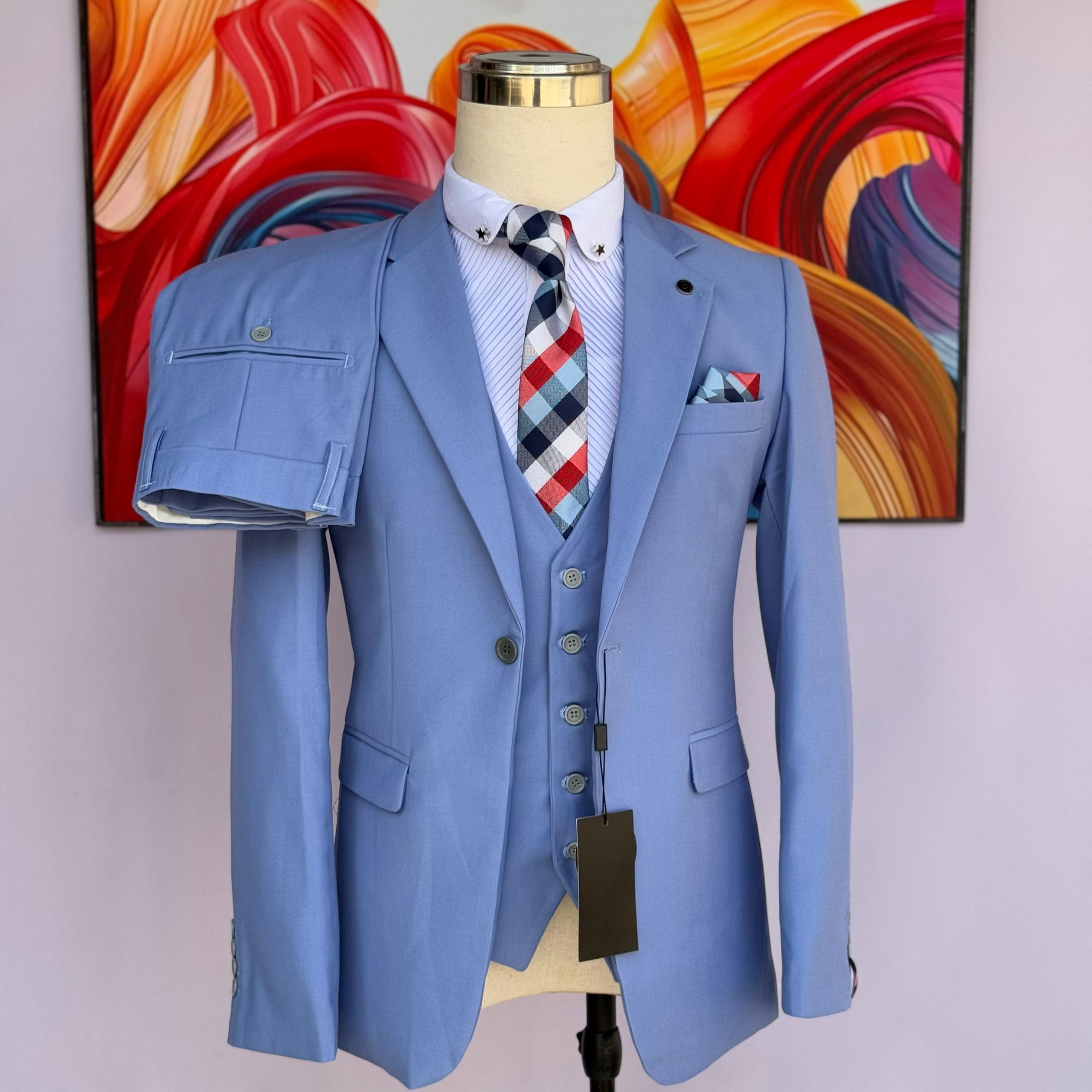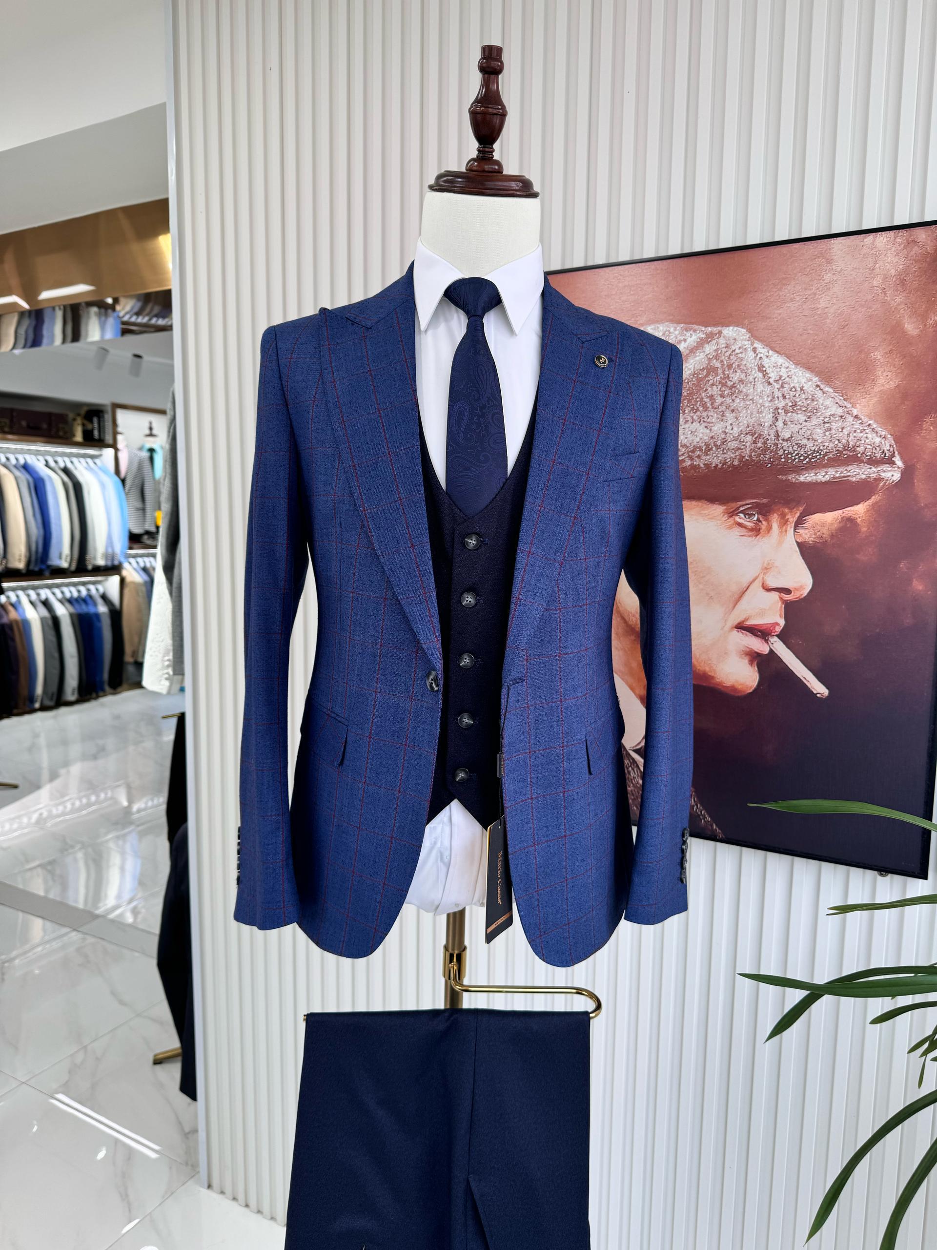 Redefine your style with this refined three-piece suit. This model stands out with its subtle blue checkered pattern, offering a look that is both professional and sharp.