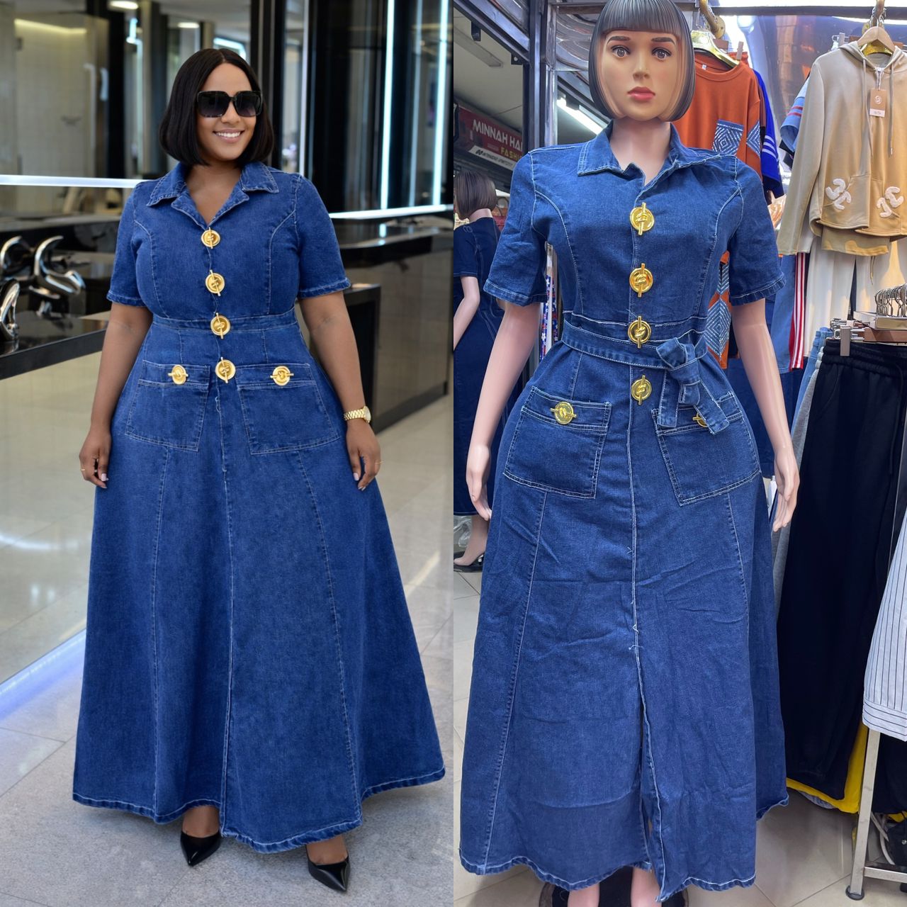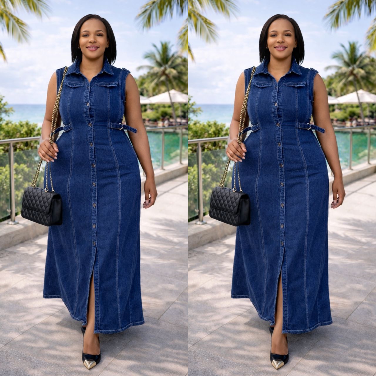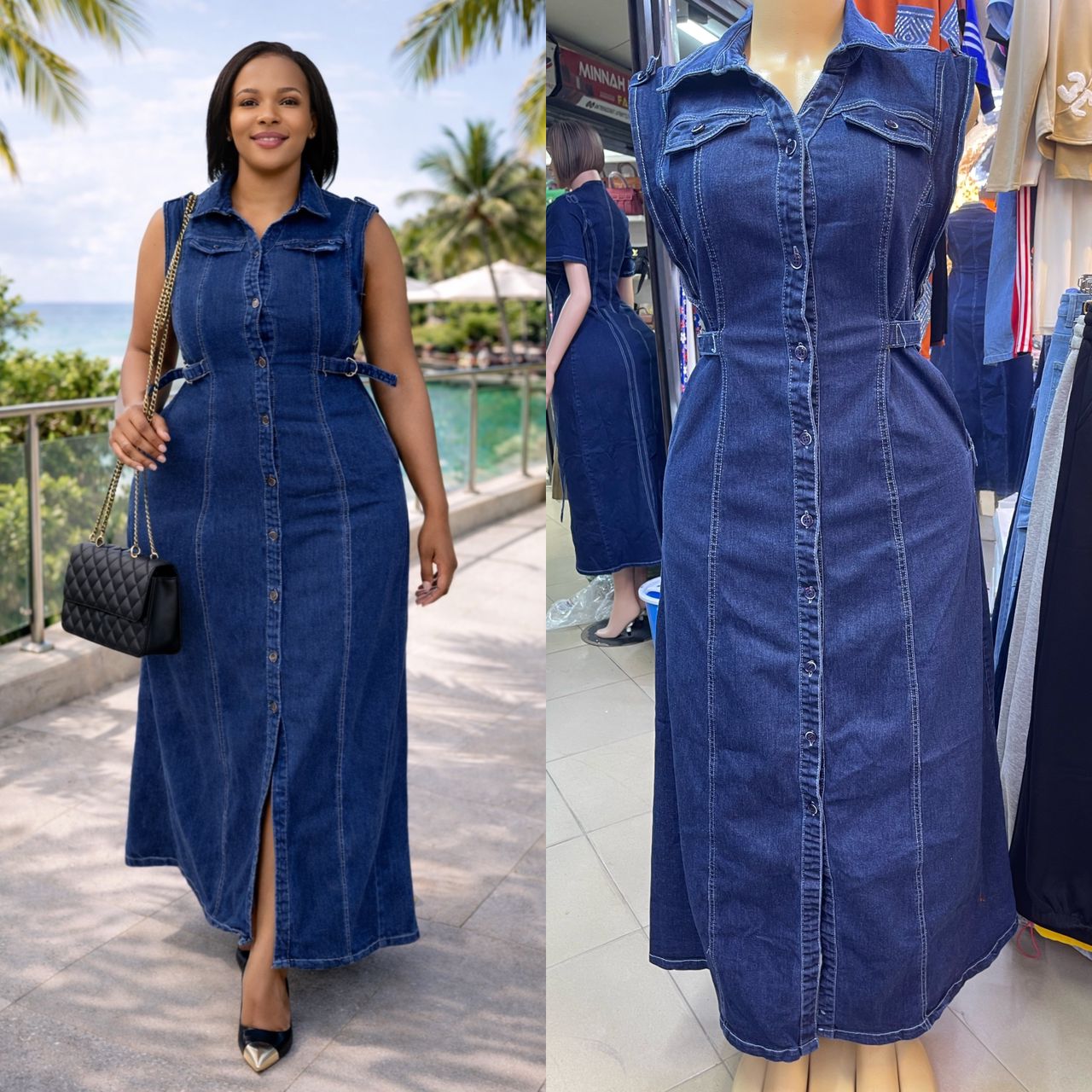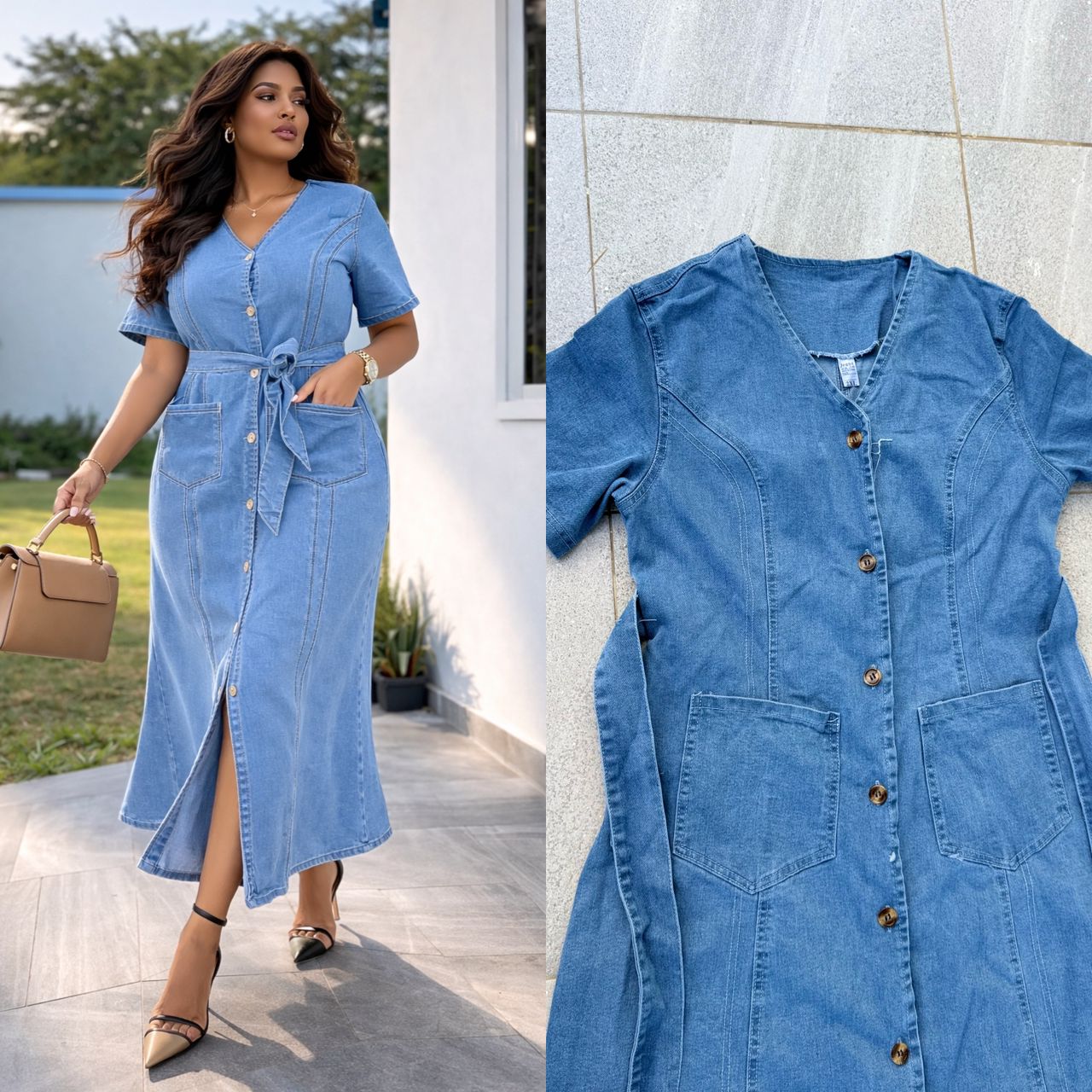 Button-Down Denim Maxi Dress – Tailored Fit with Waist Tie