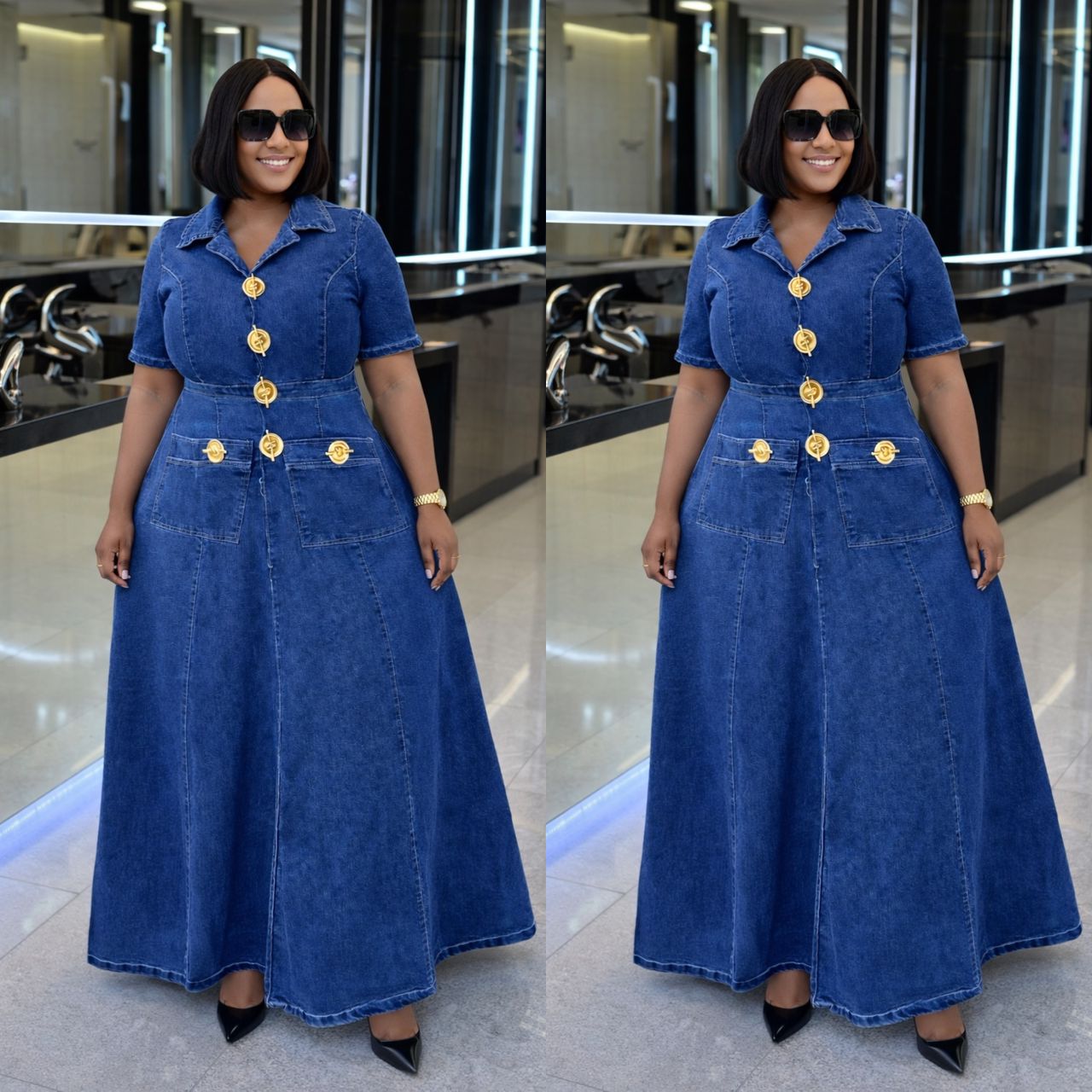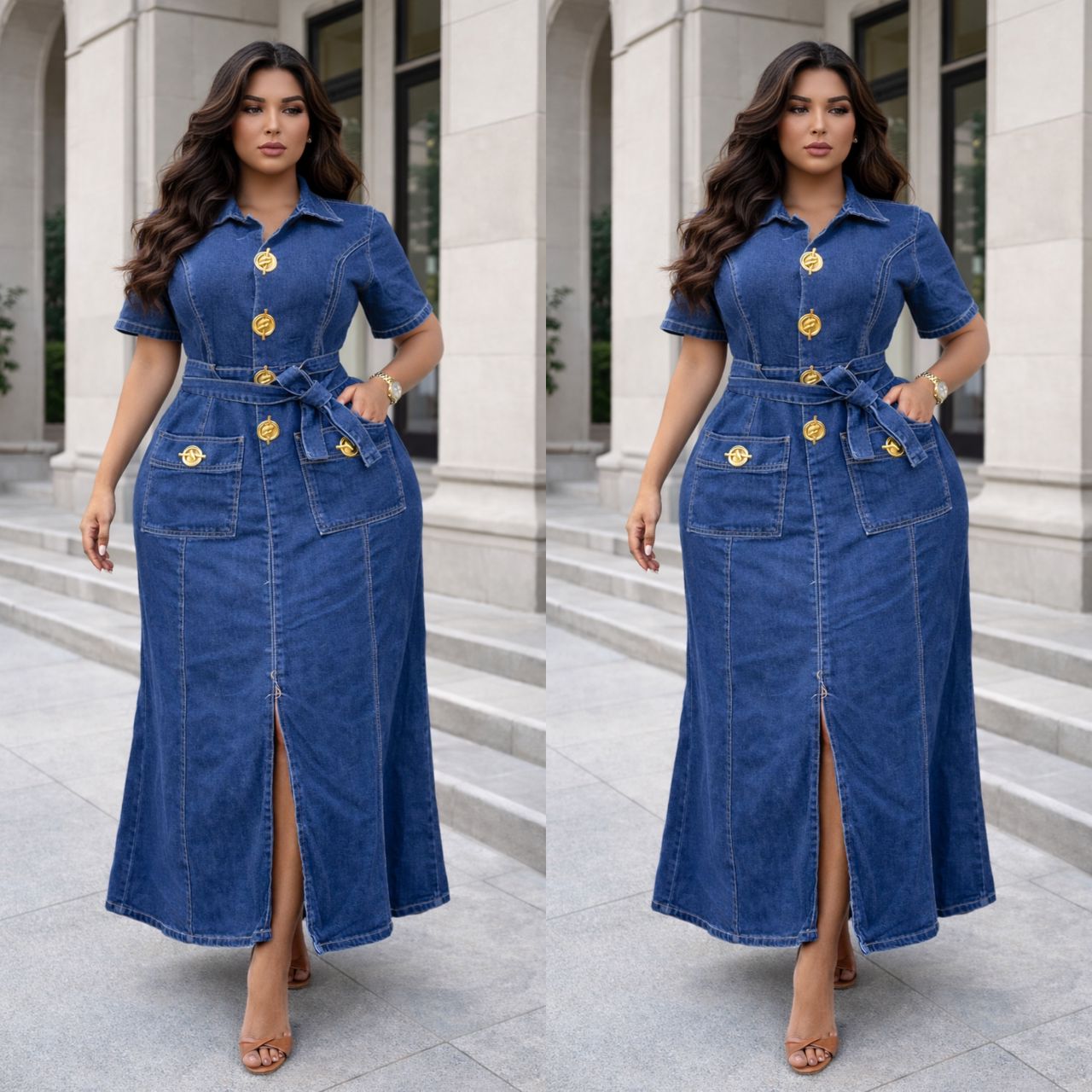 Blend elegance and casual flair with this stunning long denim dress. Featuring a structured cut and refined details, it’s a must-have staple for your summer and autumn wardrobe.