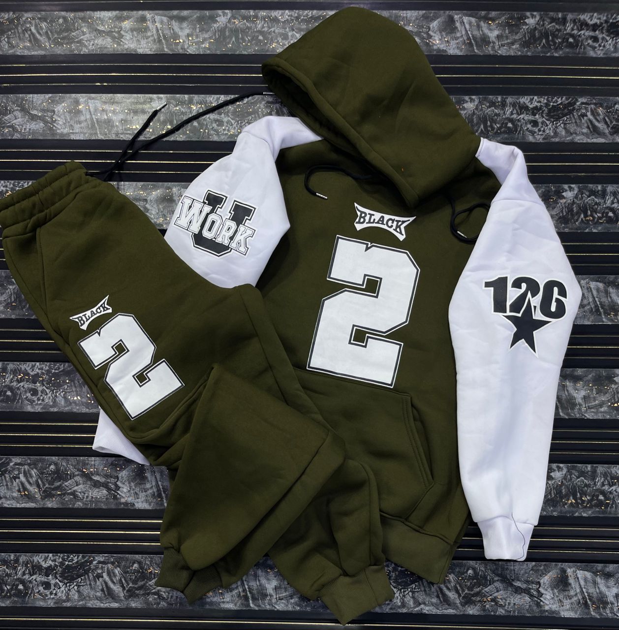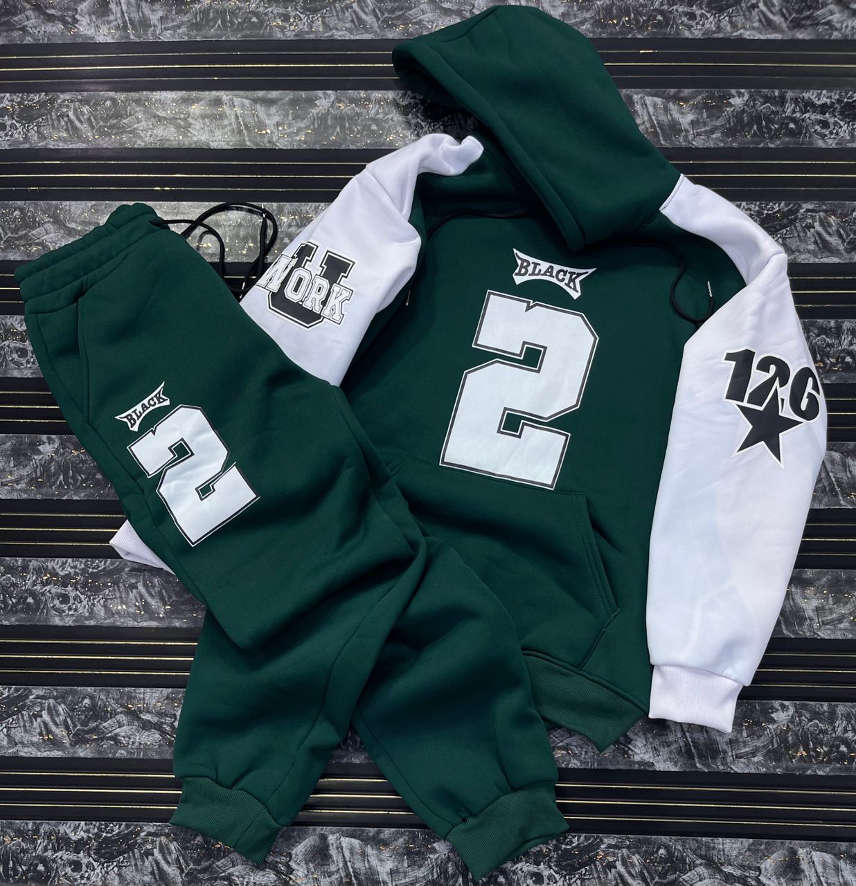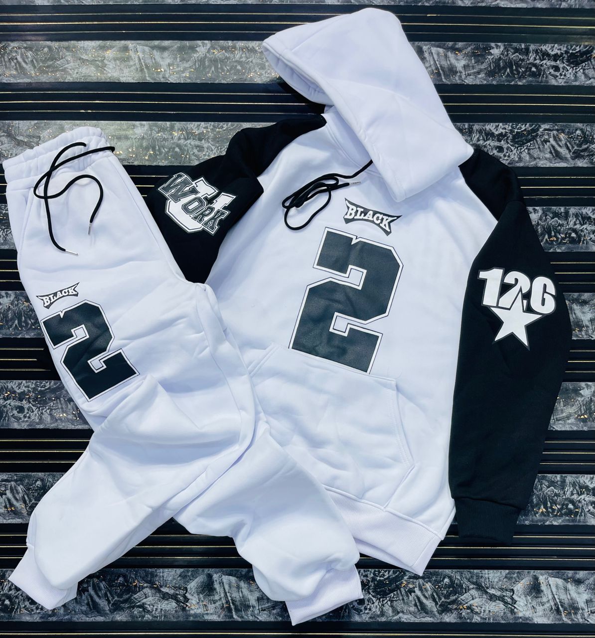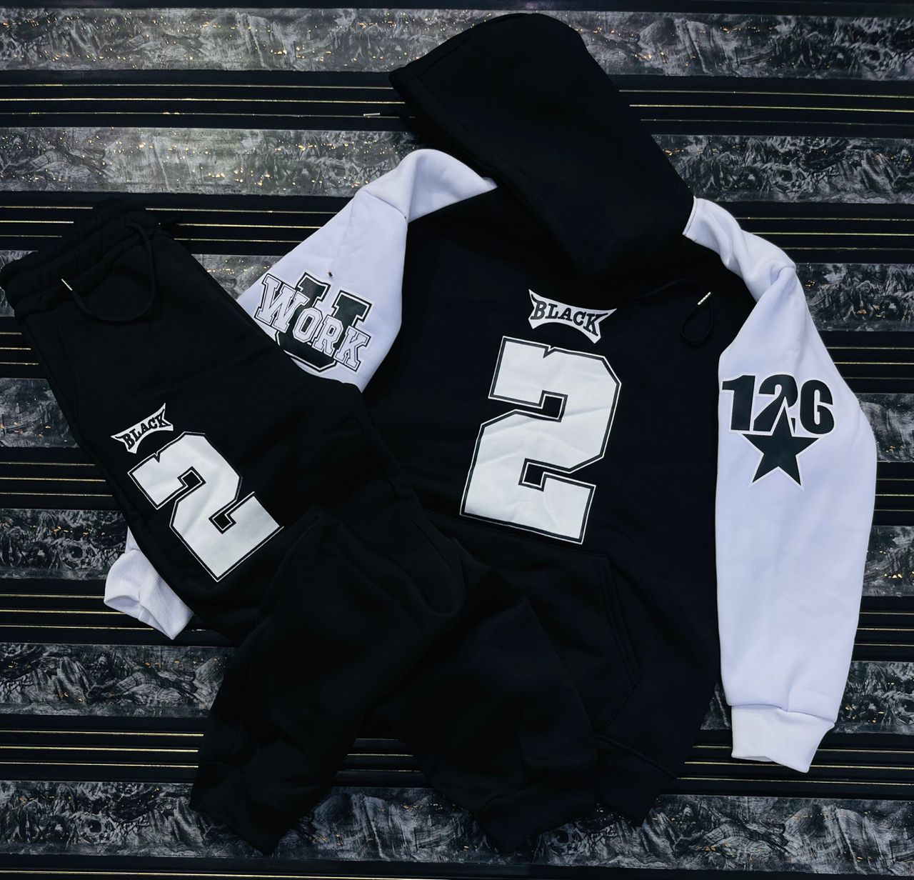 Make a bold statement with this high-contrast streetwear tracksuit. Merging urban aesthetics with ultimate comfort, this two-piece set features eye-catching varsity-style graphics and a vibrant color-block design.