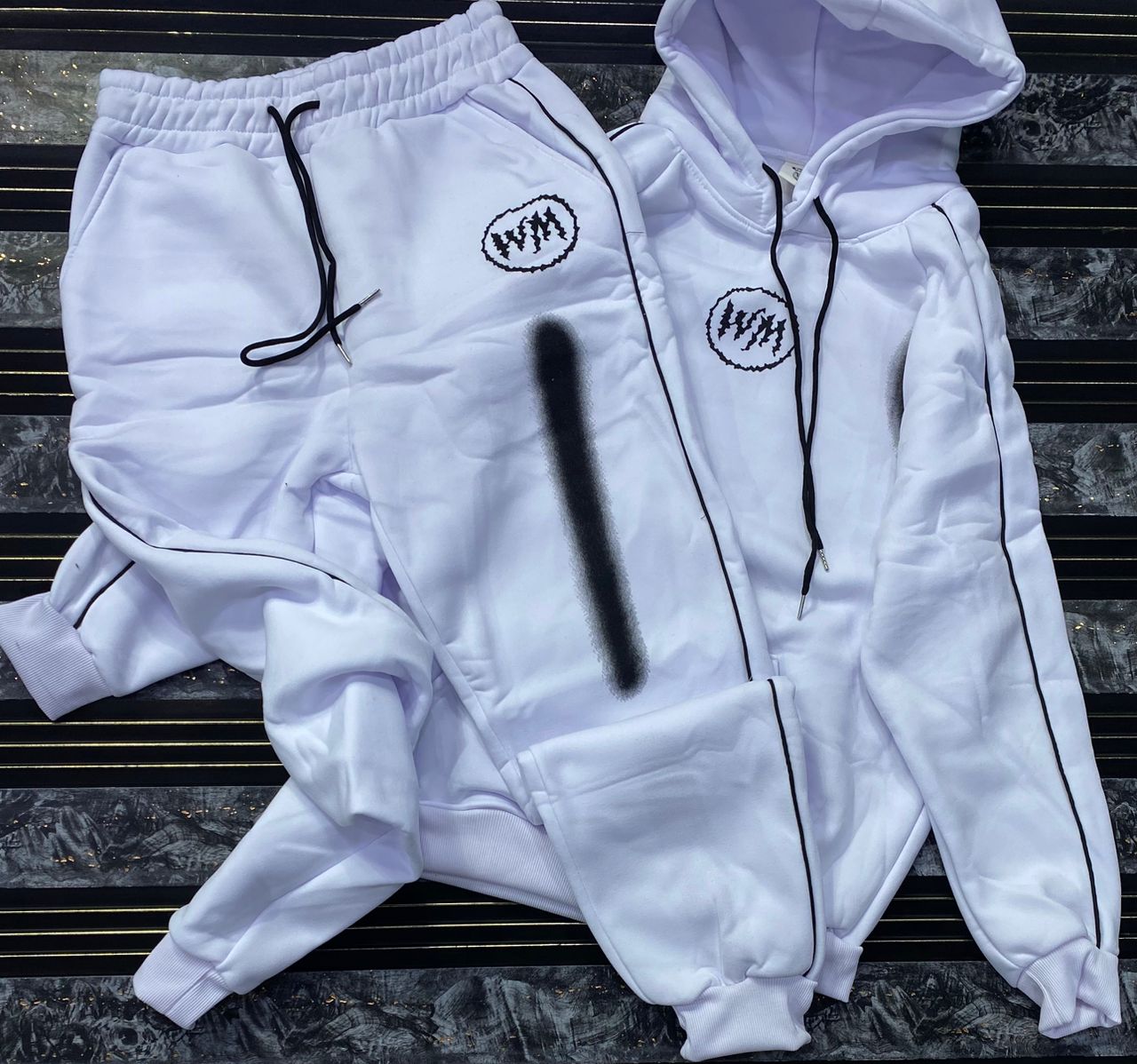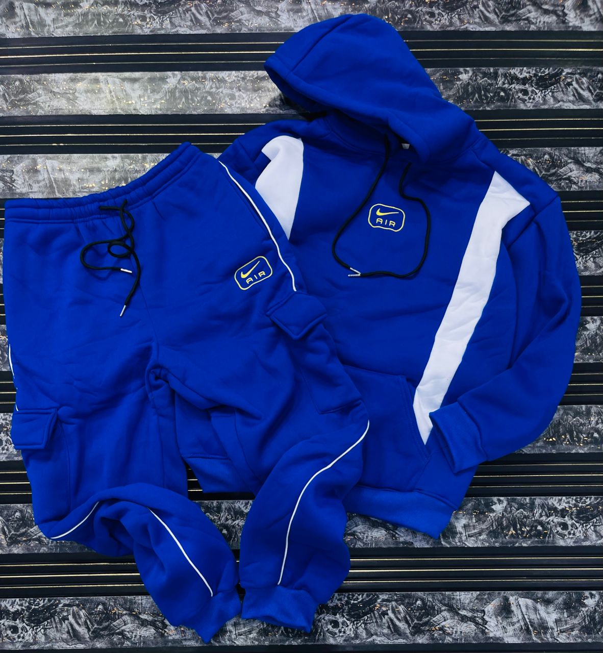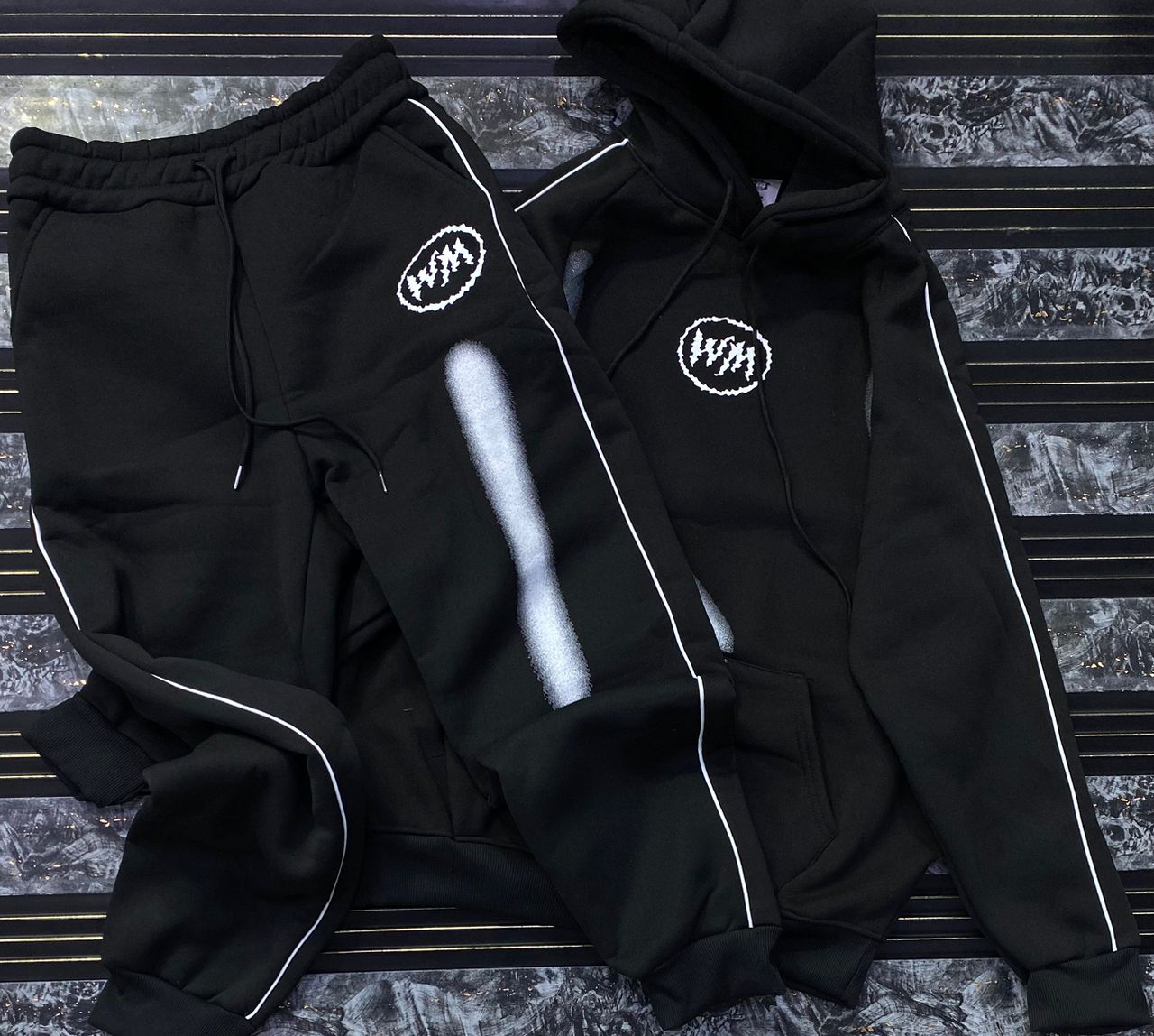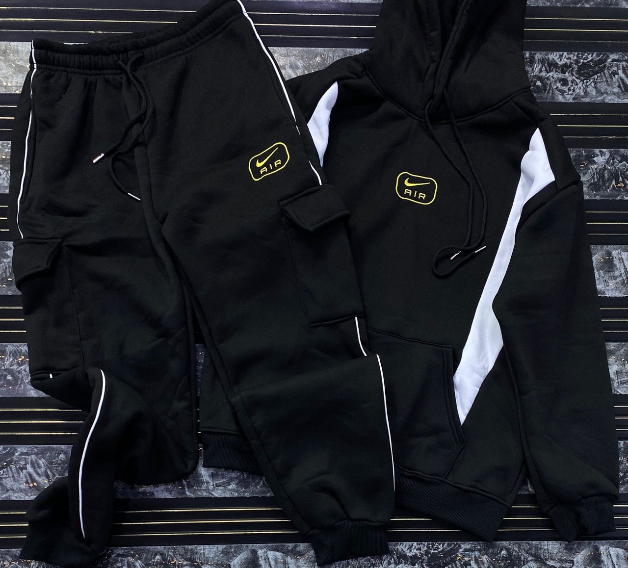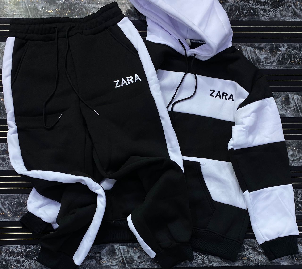 Make a bold statement with this high-contrast streetwear tracksuit. Merging urban aesthetics with ultimate comfort, this two-piece set features eye-catching varsity-style graphics and a vibrant color-block design.