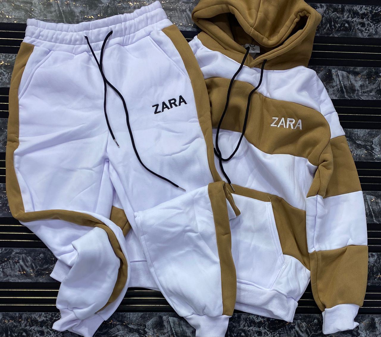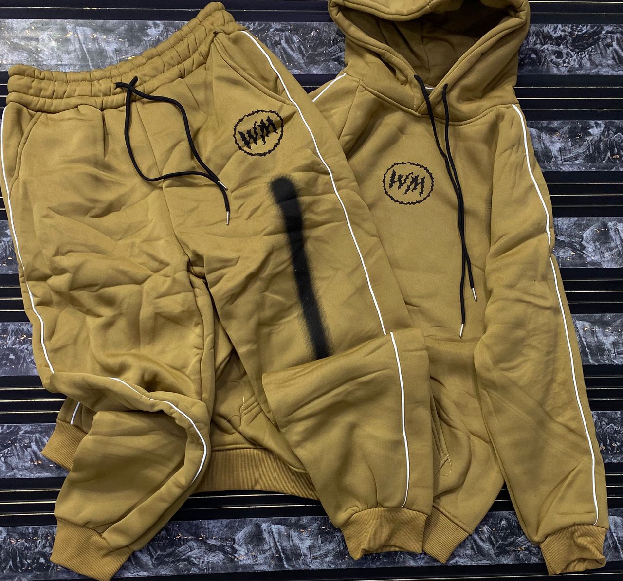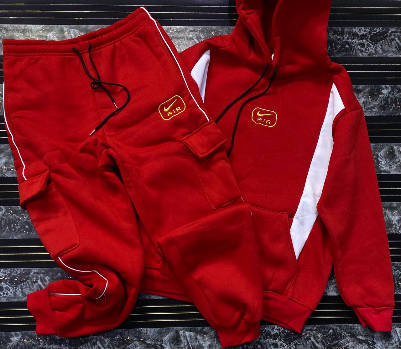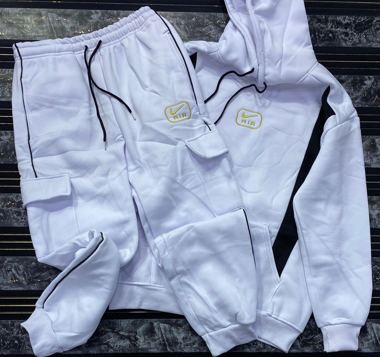 Make a bold statement with this high-contrast streetwear tracksuit. Merging urban aesthetics with ultimate comfort, this two-piece set features eye-catching varsity-style graphics and a vibrant color-block design.