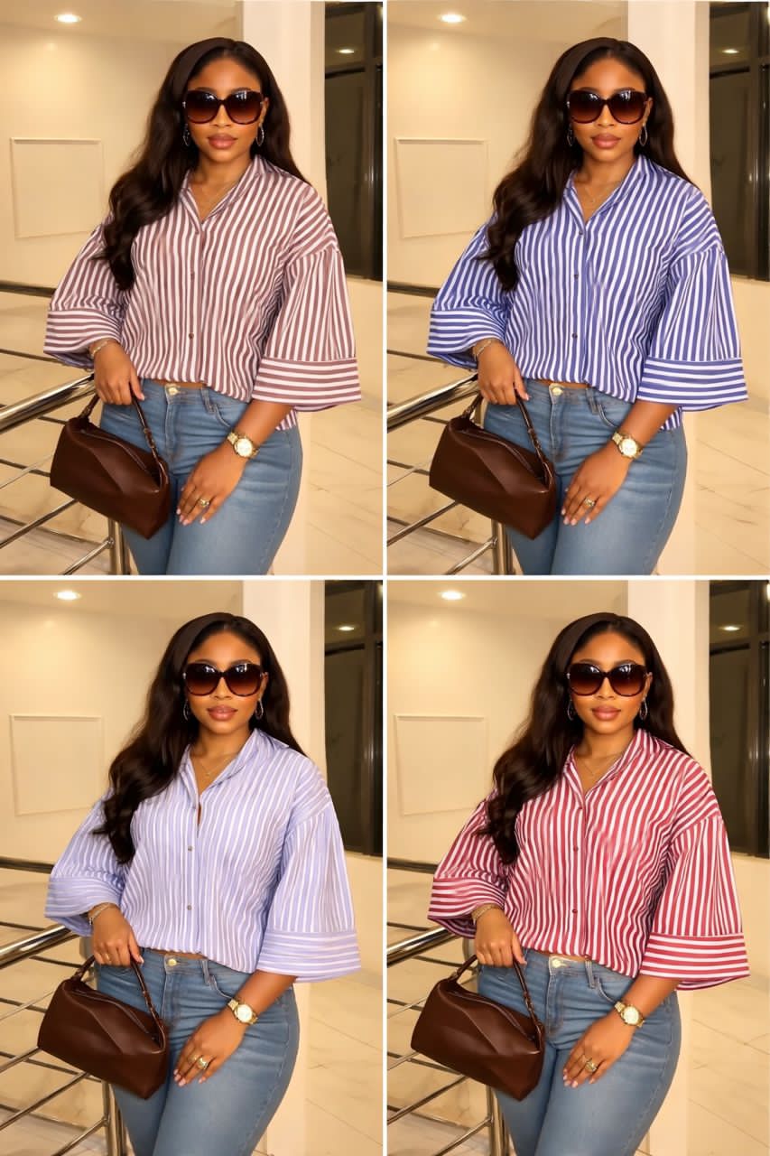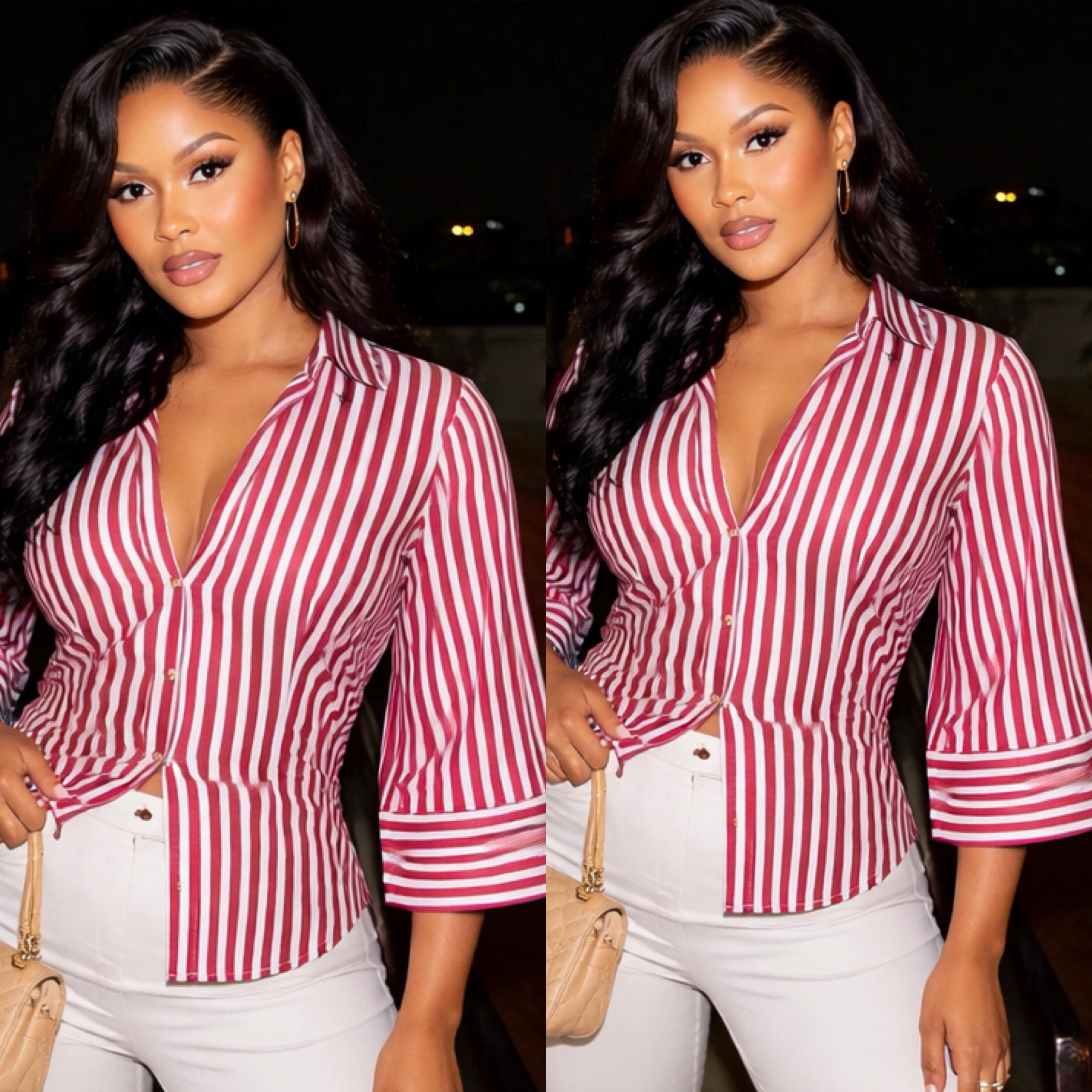 Blue Striped Tailored Blouse – Chic V-Neck with Flared Sleeves