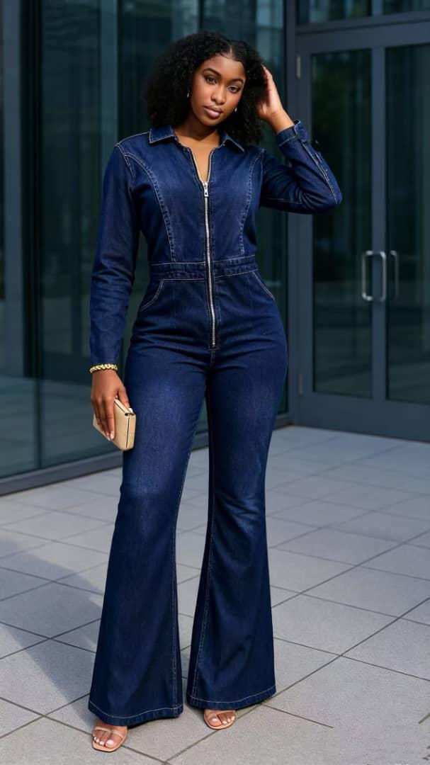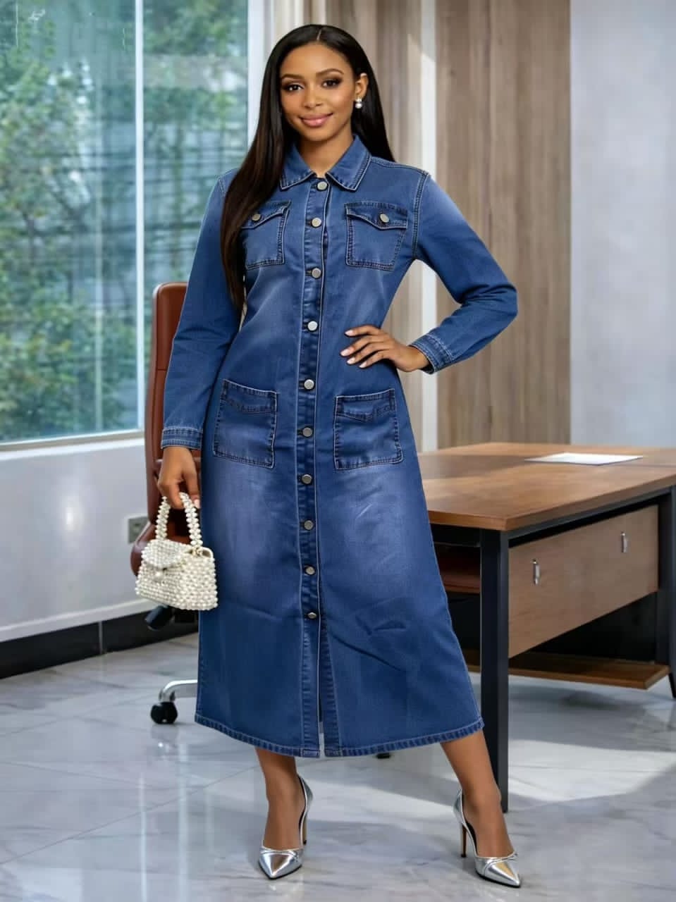 Make a statement with this stunning long denim dress. Combining comfort and sophistication, it features a tailored fit that beautifully contours the silhouette.