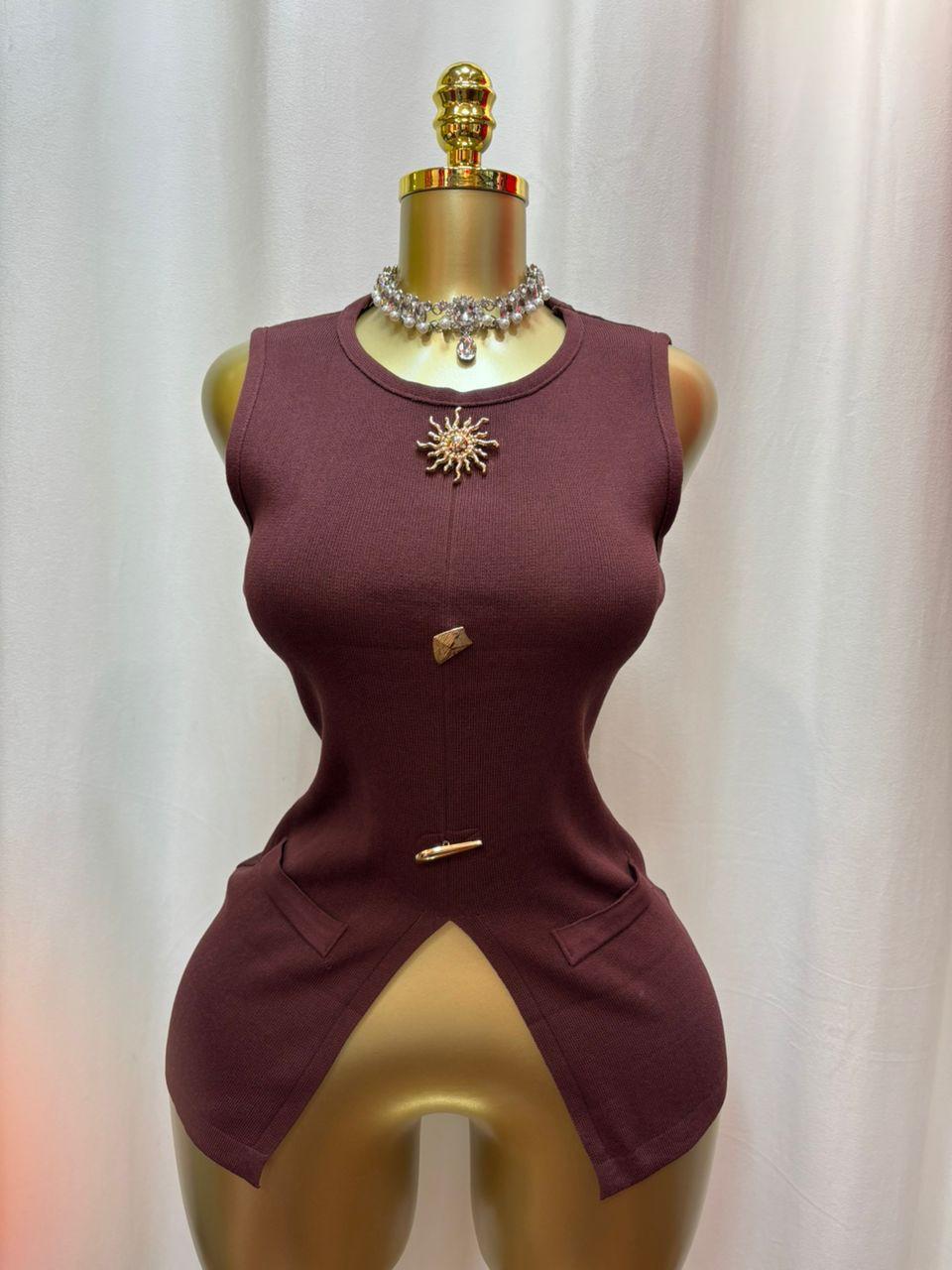 Make a statement with this unique sky-blue knit top, designed to highlight your silhouette. This sleeveless piece features a form-fitting cut with a bold inverted "V" front slit, perfect for a modern and chic aesthetic.