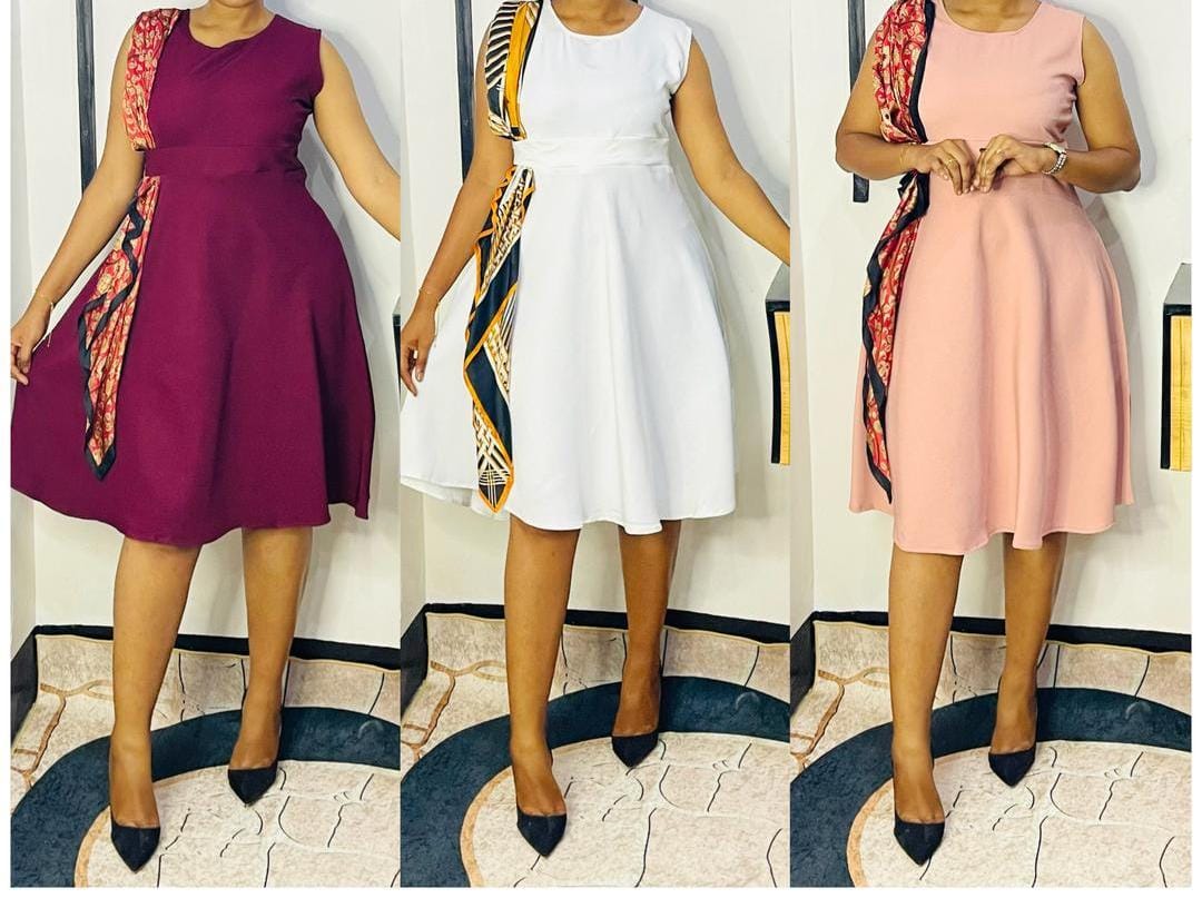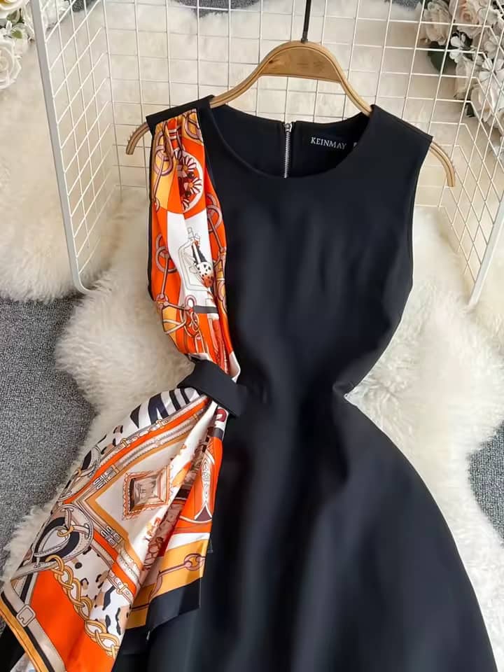 Make a statement with this stunning sleeveless midi dress, where minimalist elegance meets bold design. Featuring a tailored fit that flatters the silhouette, this dress stands out with its vibrant silk-style scarf panel for a touch of luxury.