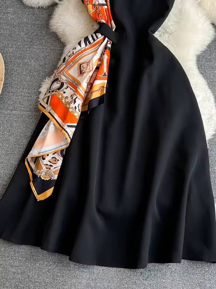 Elegant Scarf-Detail Midi Dress - Chic Black & Orange