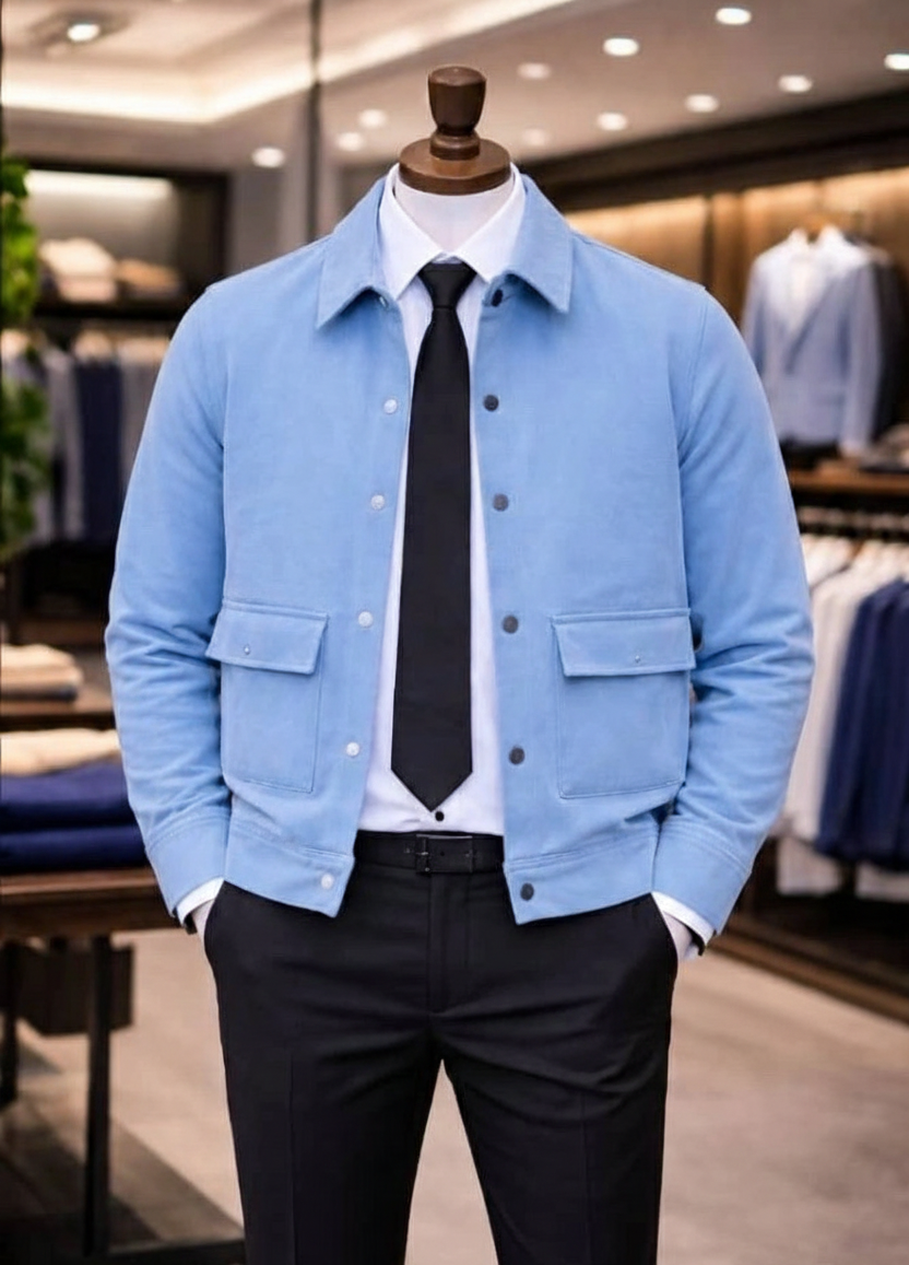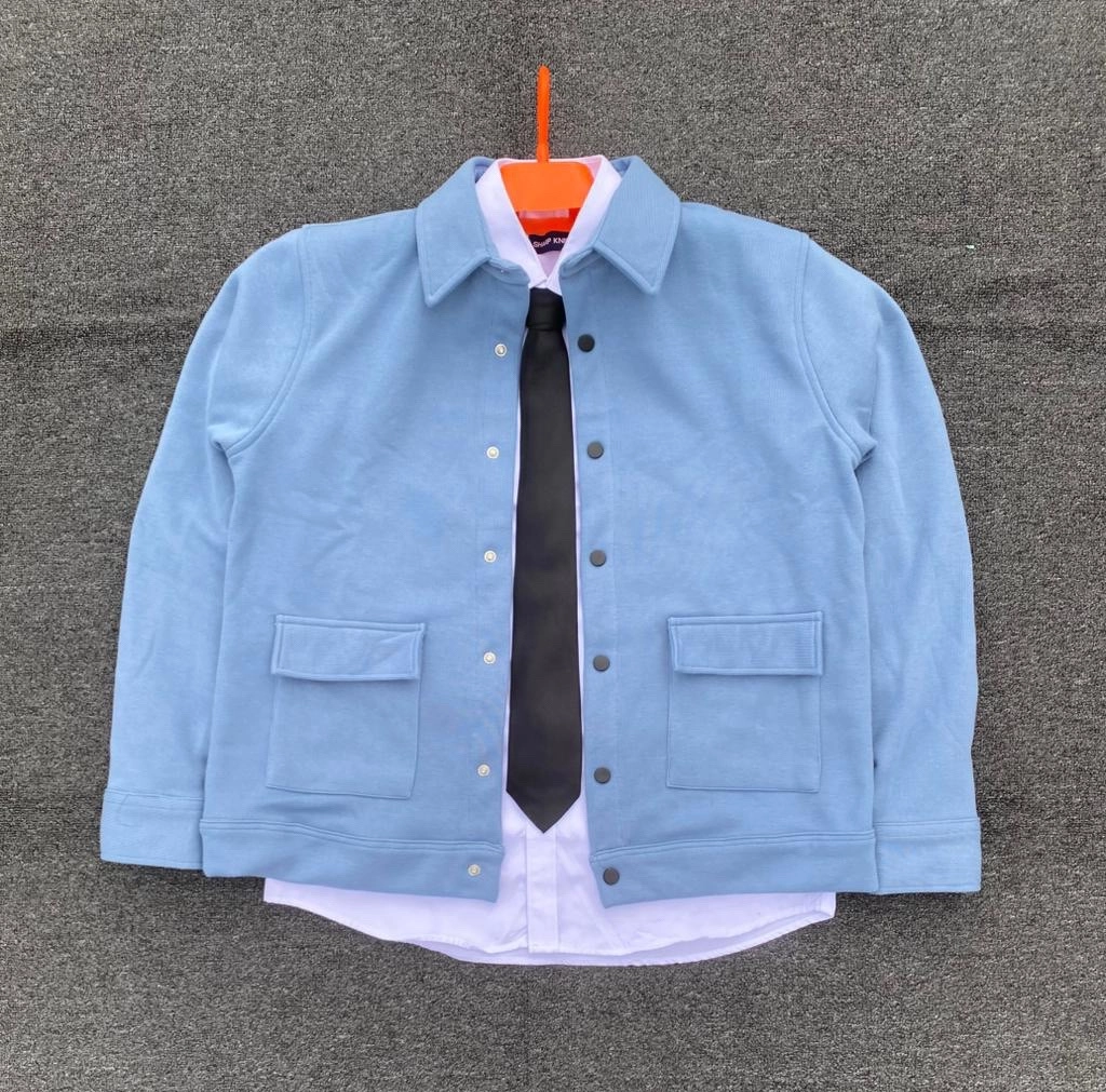 Elevate your everyday wardrobe with this sky blue button-up jacket. Crafted from soft sweatshirt fabric, it combines the ultimate comfort of a fleece with the sharp silhouette of a classic chore coat.