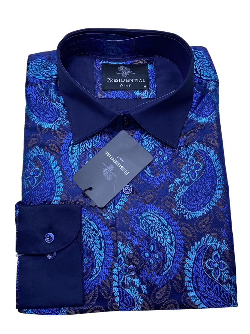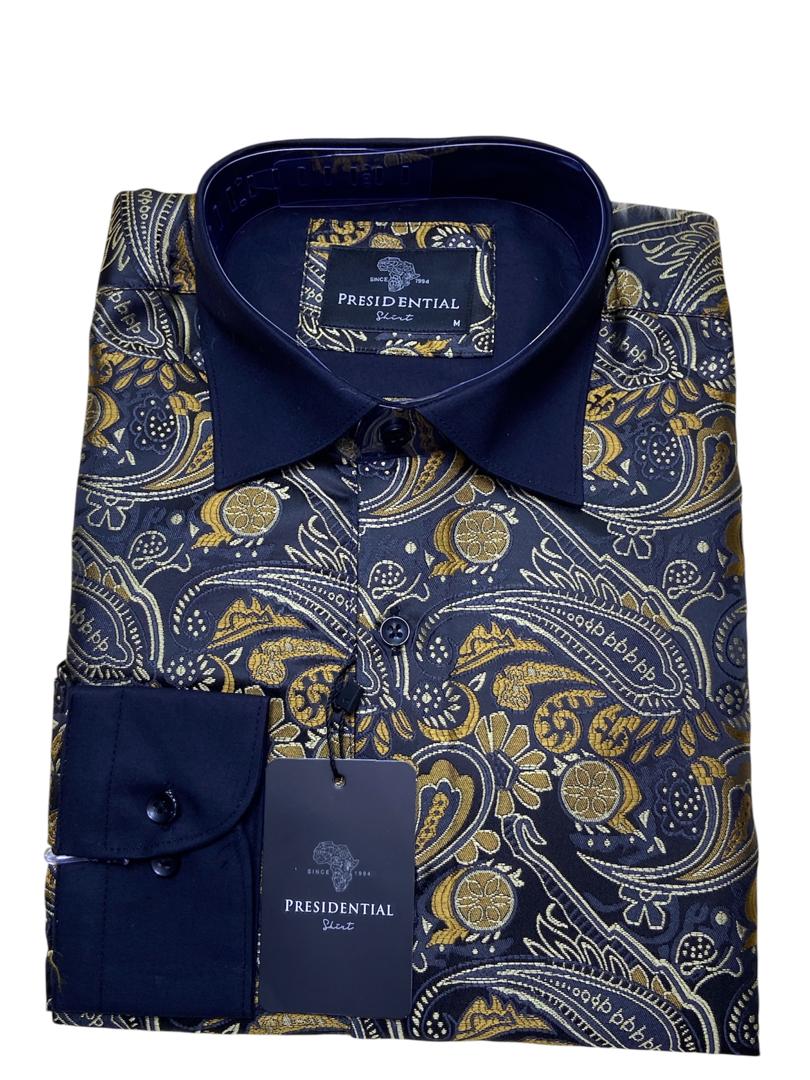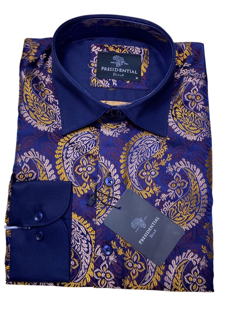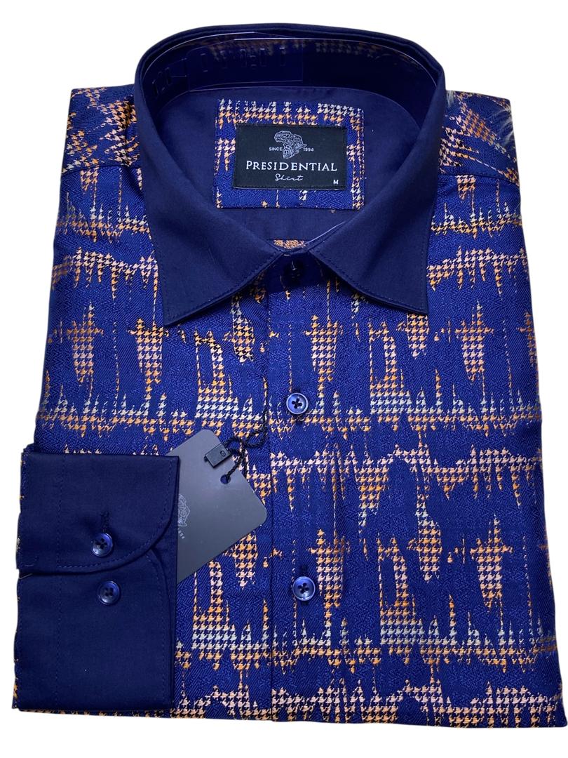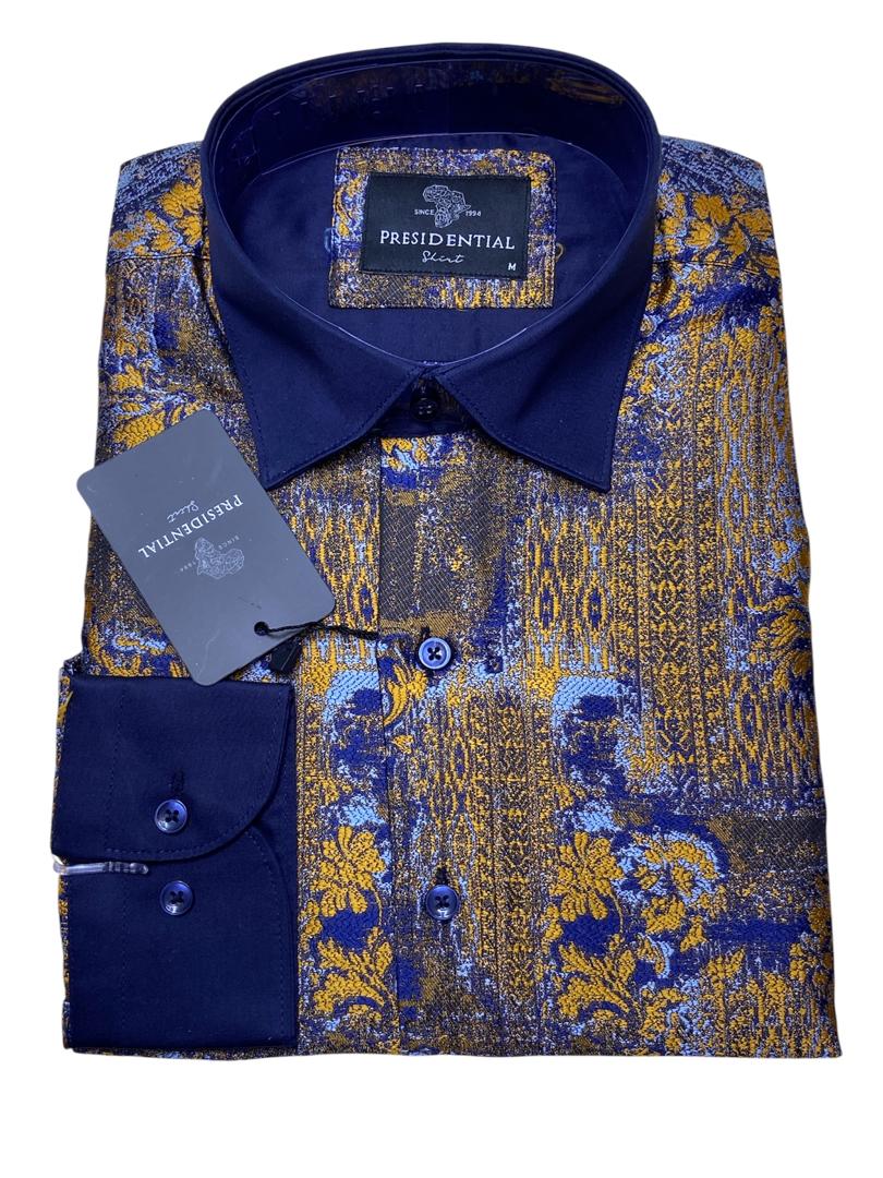 Make a bold statement with this premium shirt from the renowned Presidential Shirt brand. Drawing inspiration from African heritage, this piece features a sophisticated patchwork of geometric patterns and spirals in rich royal blue, gold, and burgundy tones.
