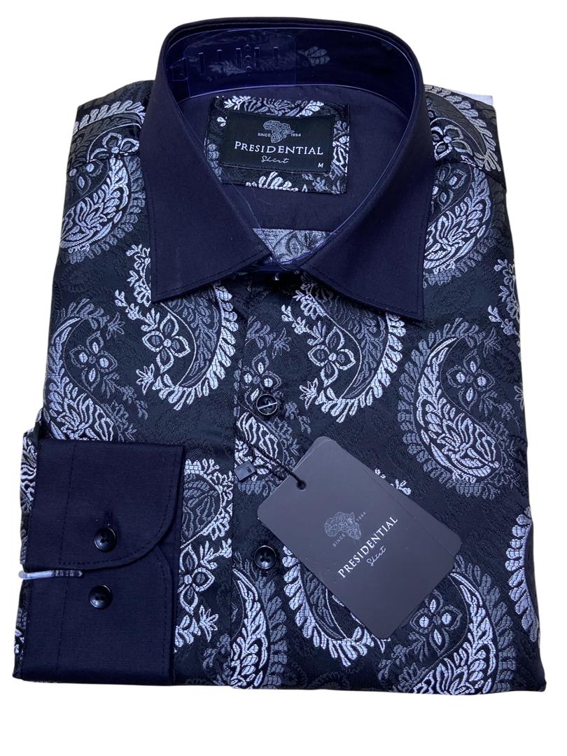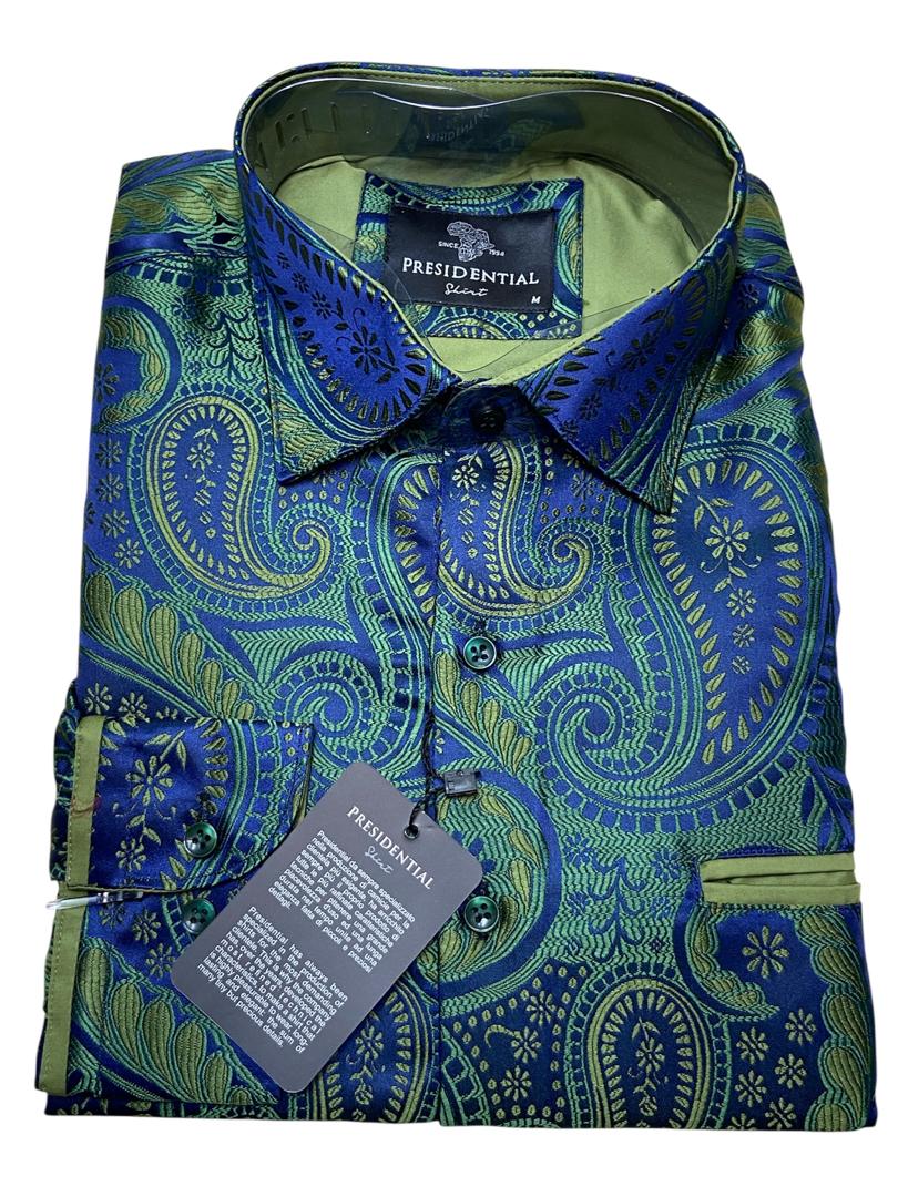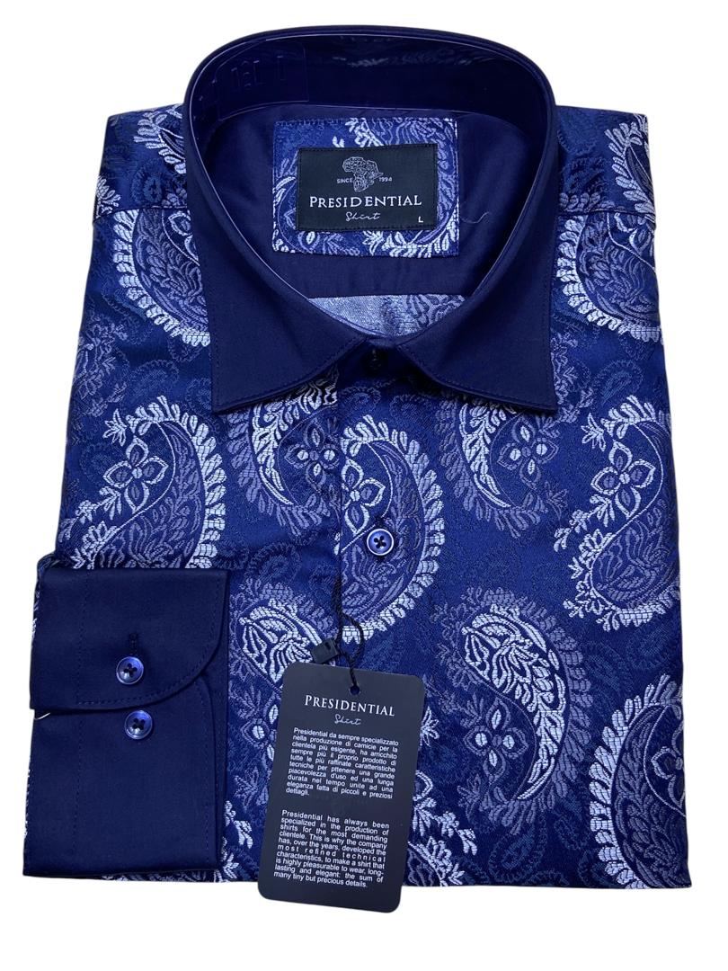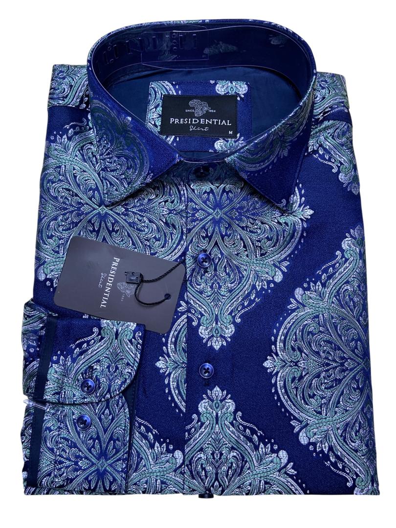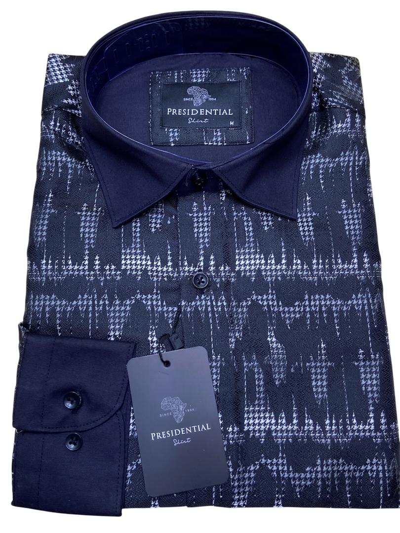 Make a bold statement with this premium shirt from the renowned Presidential Shirt brand. Drawing inspiration from African heritage, this piece features a sophisticated patchwork of geometric patterns and spirals in rich royal blue, gold, and burgundy tones.