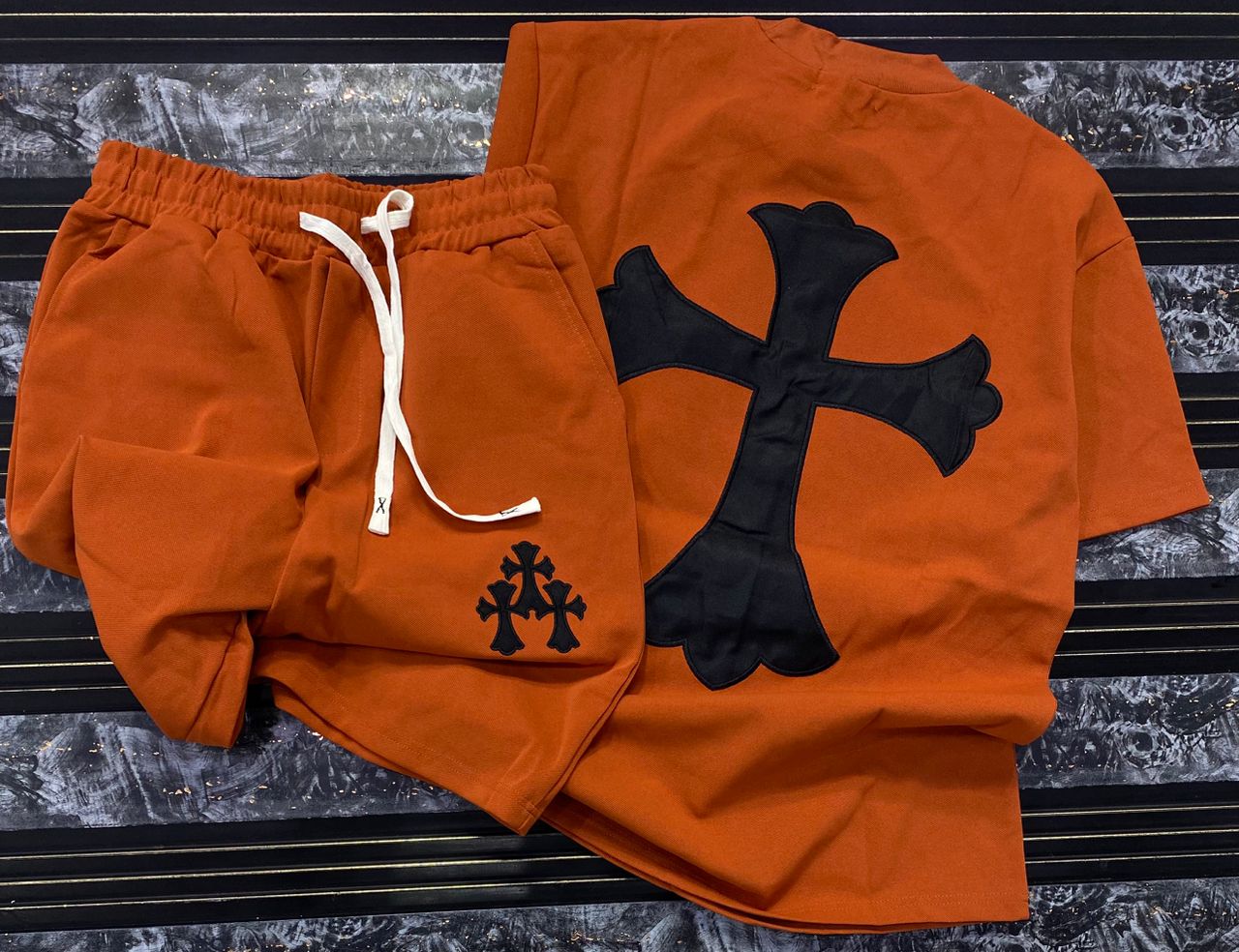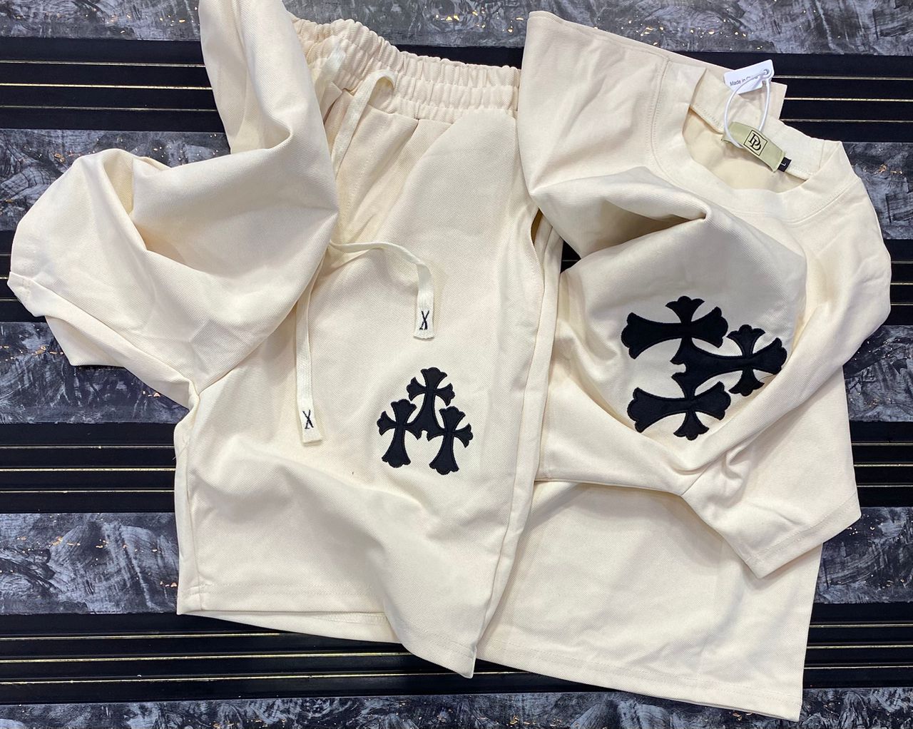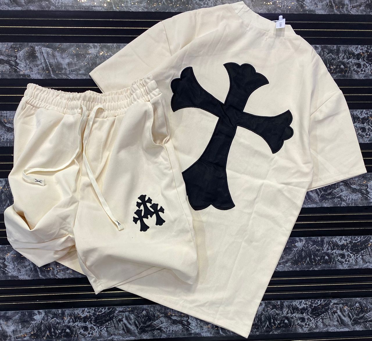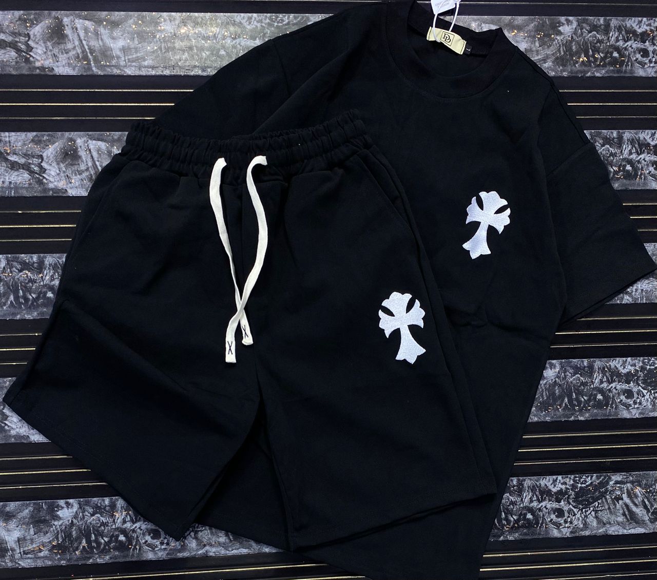“Cross Graphics” Shorts and T-shirt Set – White & Black