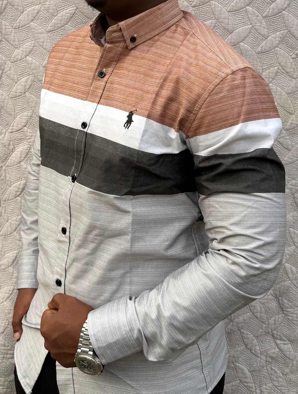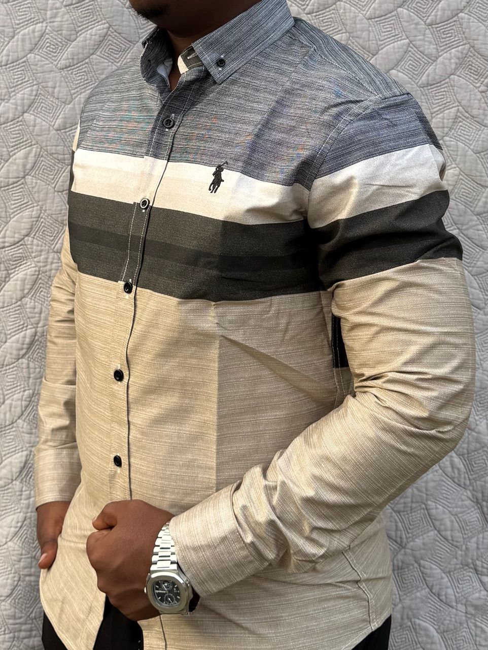 Elevate your wardrobe with this modern long-sleeved shirt featuring a distinctive multi-textured design. This piece showcases a sophisticated blend of beige, grey, and earth-toned horizontal stripes, accented by the iconic embroidered logo on the chest