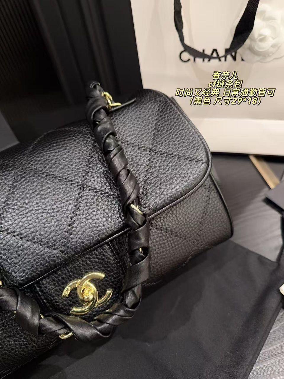 Black Grained Leather Handbag – Classic Quilted Style with Braided Handle