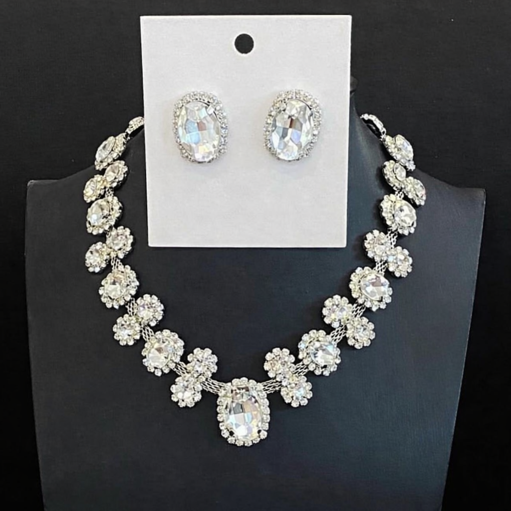 Design: A statement necklace adorned with sparkling oval and round crystals, set on a delicate silver-tone setting.