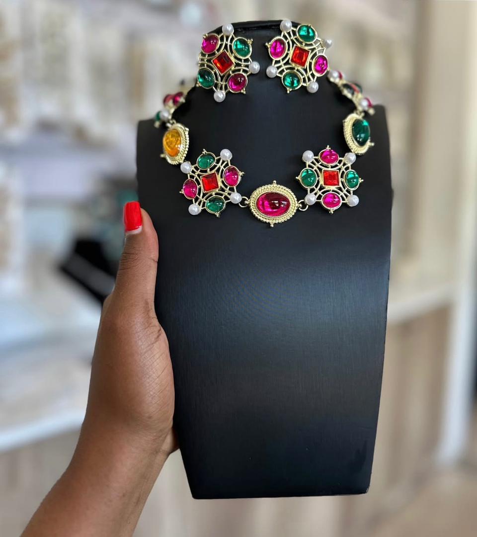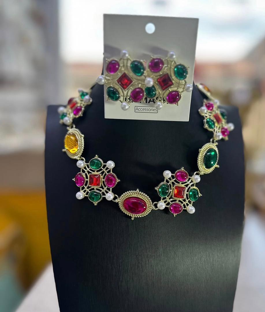 Elevate your look with this dazzling and colorful jewelry set. Combining vintage design with modern elegance, this set includes a statement necklace and matching earrings, adorned with vibrant colored stones and delicate pearls.