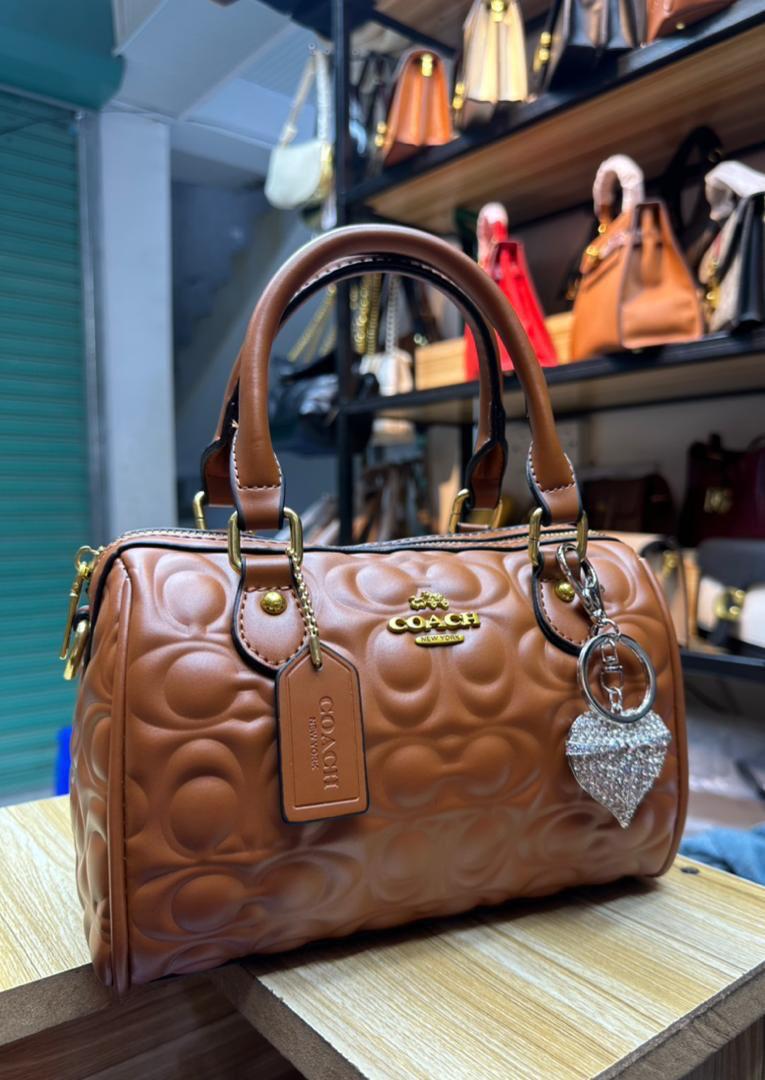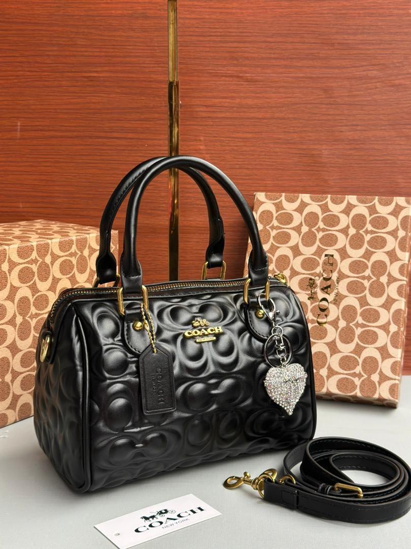 Add a touch of luxury to your wardrobe with this stunning Coach Rowan bag. This iconic "Boston Bag" features high-quality black leather with an embossed (quilted) Coach signature pattern.
