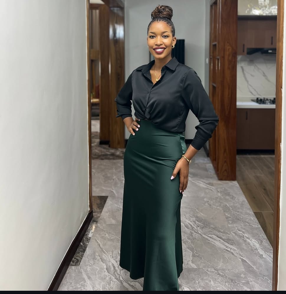 Top: A flowing black satin shirt with a modern cut, buttoned and tied at the waist to flatter the figure.