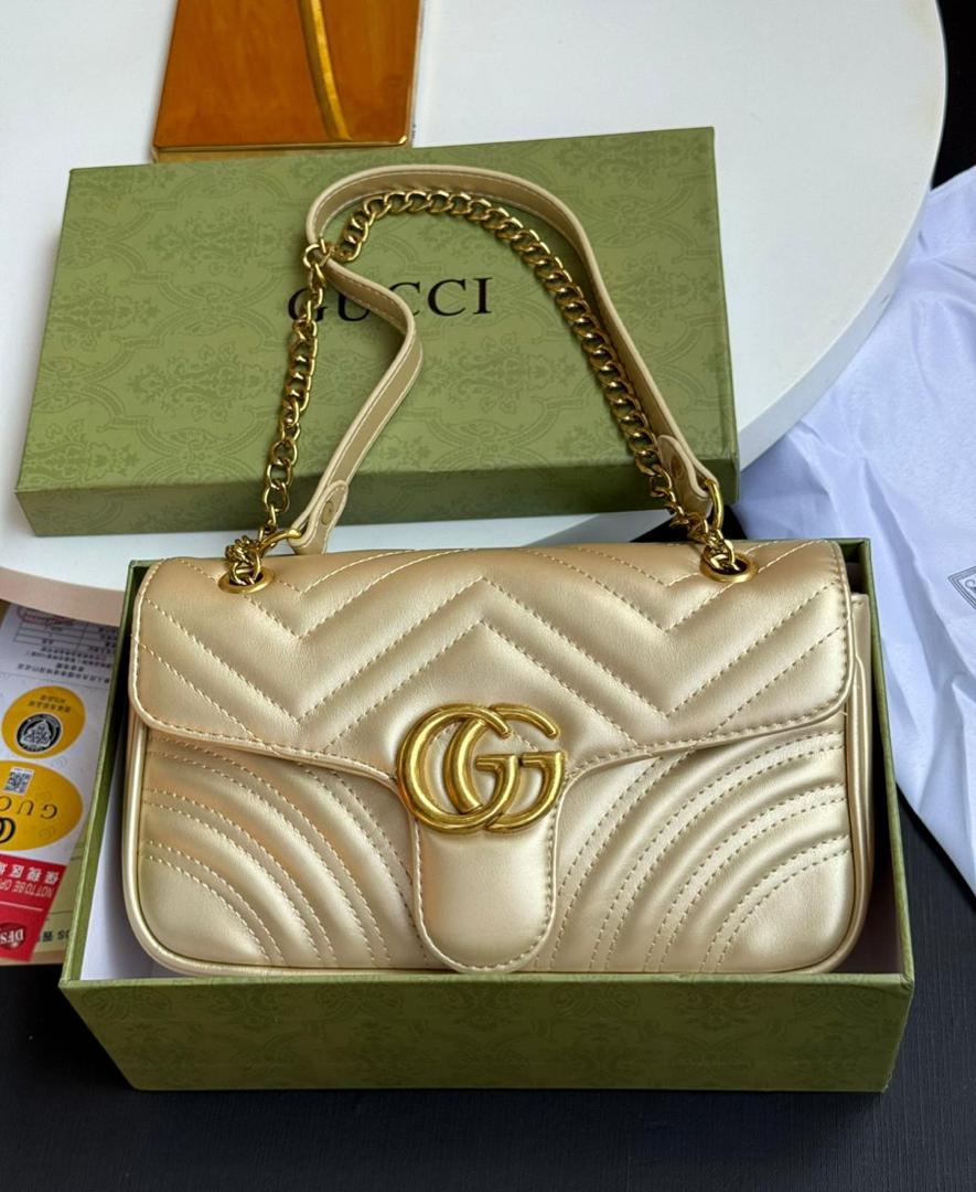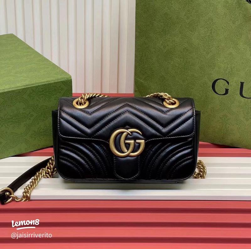 Iconic details: Antiqued gold-tone metal Double G logo on the front.