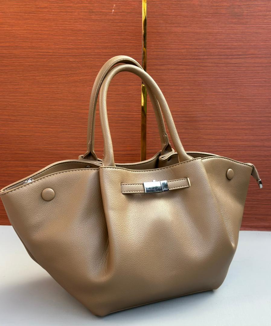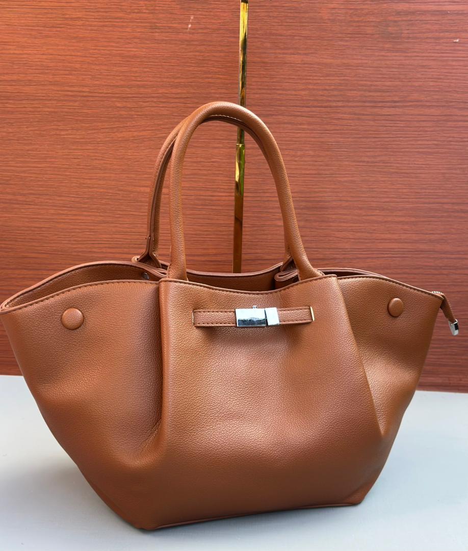 Add a touch of sophistication to your wardrobe with this beautiful tobacco-colored grained faux leather handbag. Its unique, flared silhouette offers a perfect blend of contemporary style and practicality.
