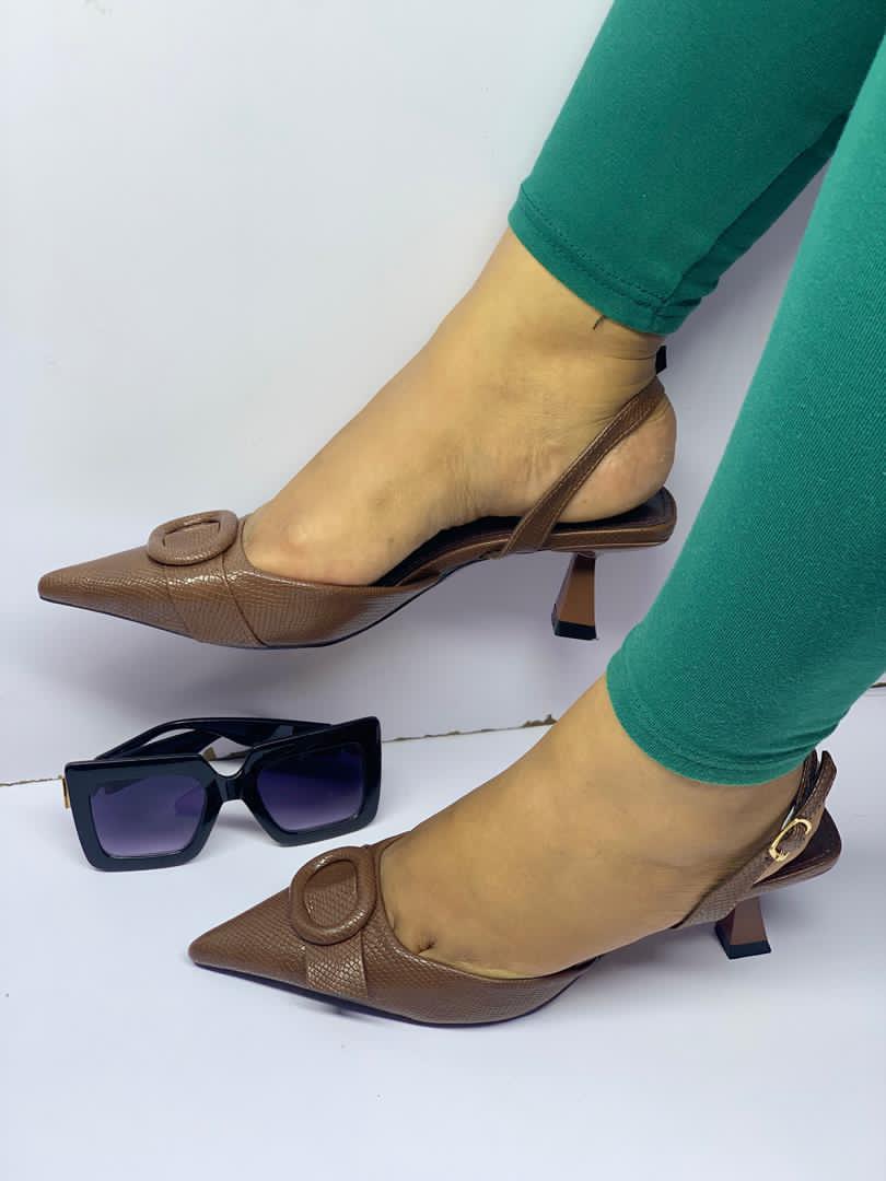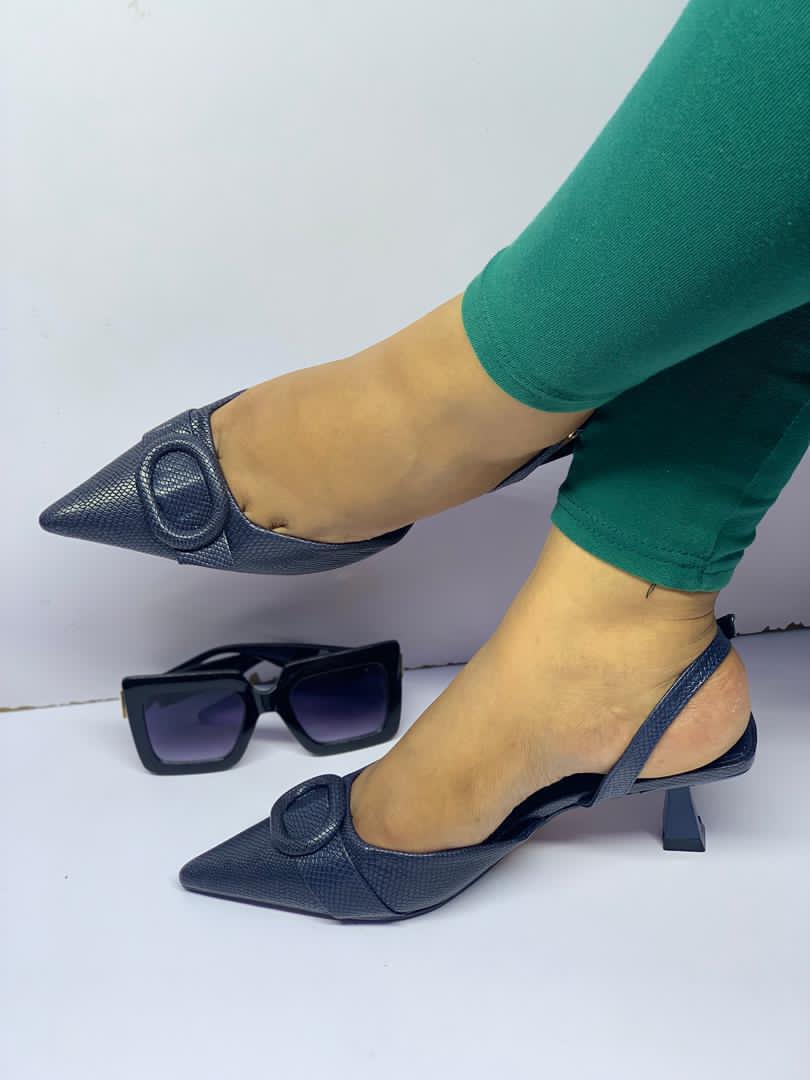Elevate your footwear collection with these sophisticated slingback pumps. Designed for the modern woman who values both comfort and high fashion, these heels feature a trendy snake-skin texture and a refined pointed toe adorned with a matching decorative buckle.rP