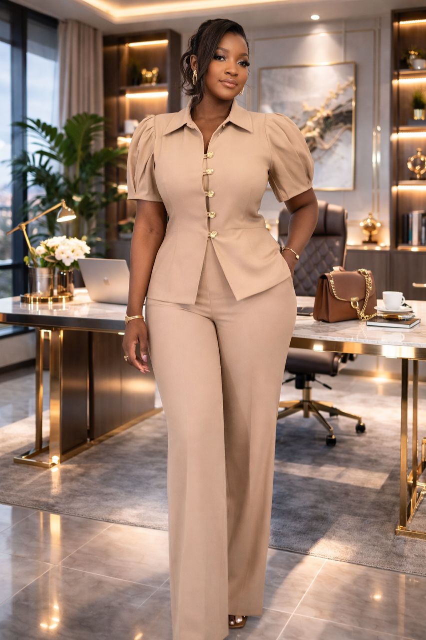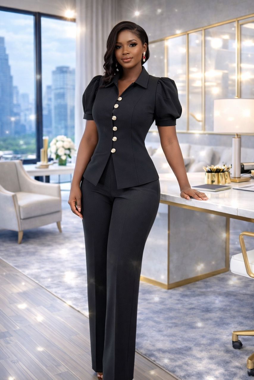 "Business Chic" Pant Set – Puff Sleeve Blazer with Gold Buttons
