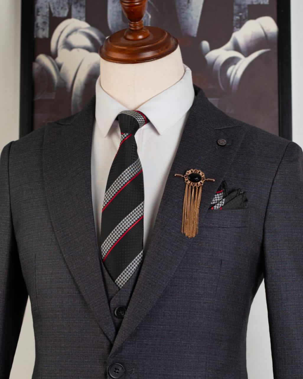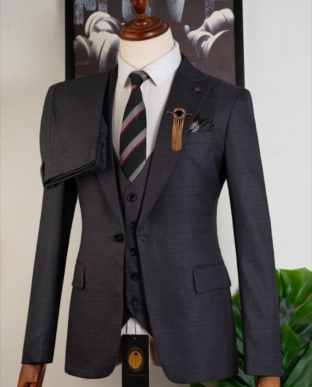Make a bold statement with this sophisticated three-piece suit, tailored for the modern man who values class and precision. The perfect choice for weddings, formal galas, or high-stakes business meetings.
