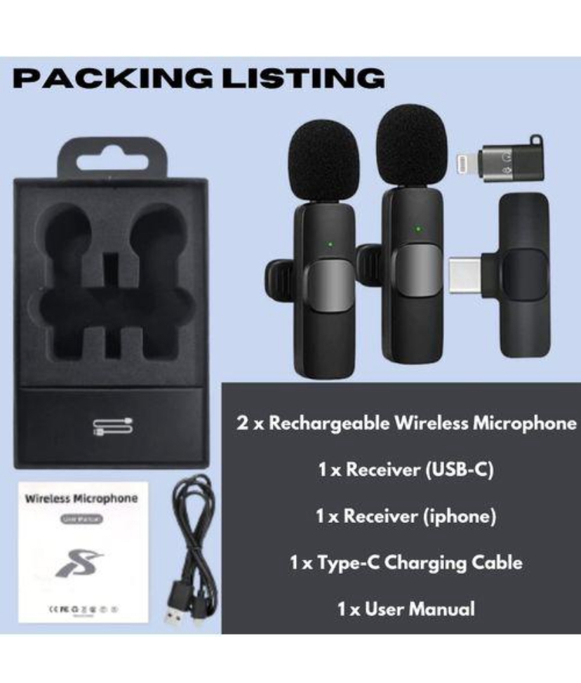 Compact wireless microphone designed for clear and stable audio recording up to 15 meters. Compatible with USB-C and iPhone devices. Ideal for vlogging, interviews, live streaming, and content creation. Easy plug-and-play setup with noise reduction for professional sound quality.