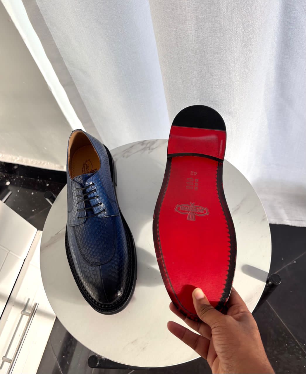 Navy Blue Scale-Textured Derby Shoes with Red Sole