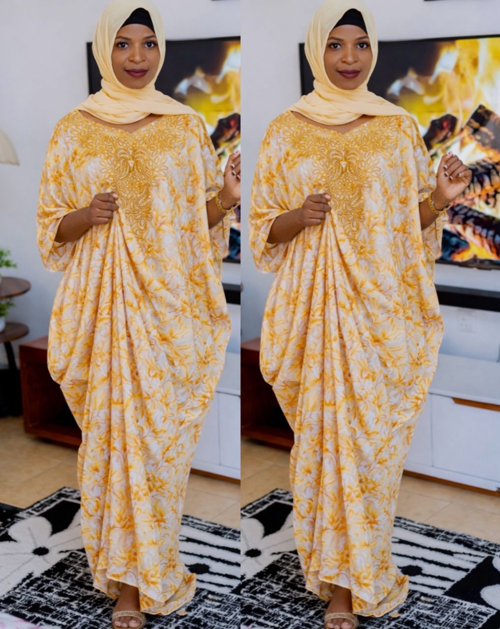 Modern African Kaftan Dress – Yellow & Burgundy Geometric Print