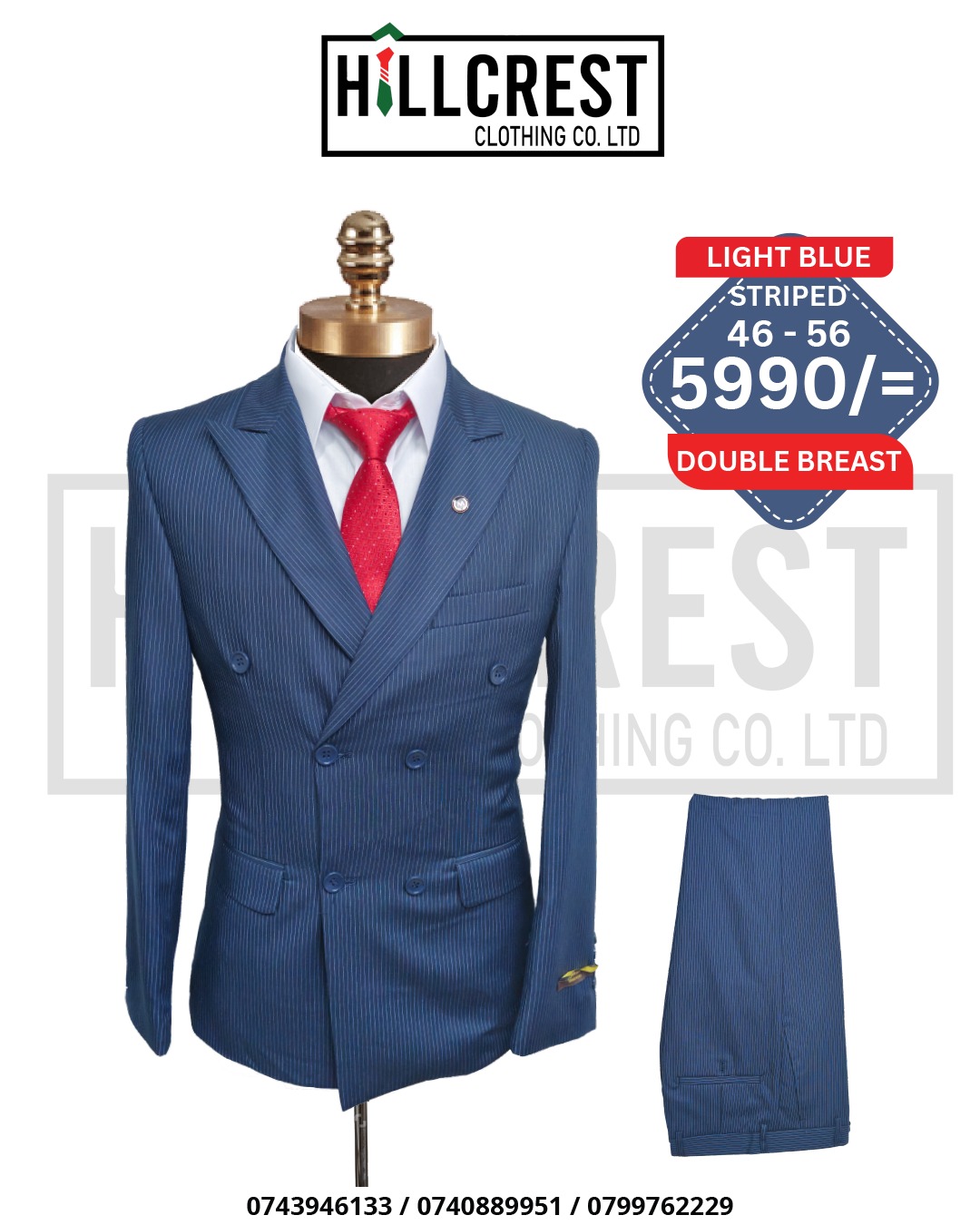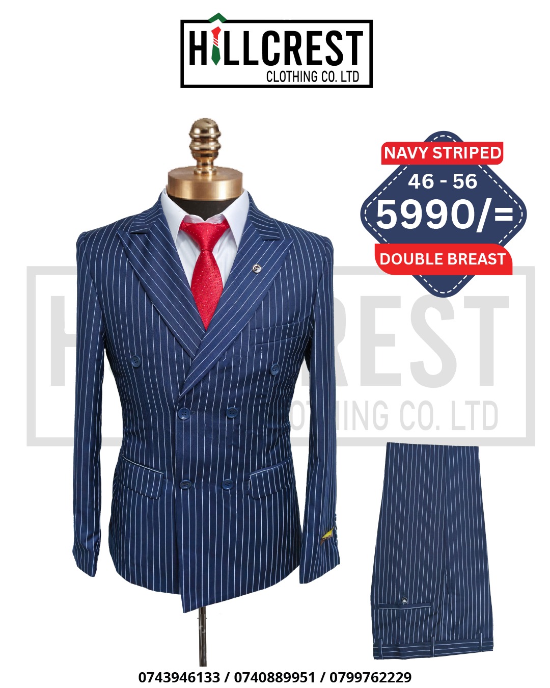 Classic double-breasted men’s suit with a sharp pinstripe design, tailored blazer, and matching trousers. Perfect for business, formal events, and special occasions.