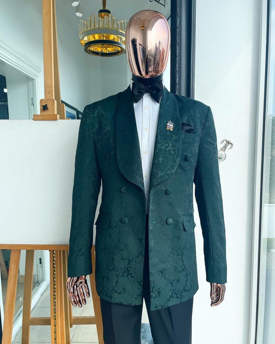 Emerald Green Double-Breasted Jacquard Tuxedo Jacket – Baroque Floral Pattern